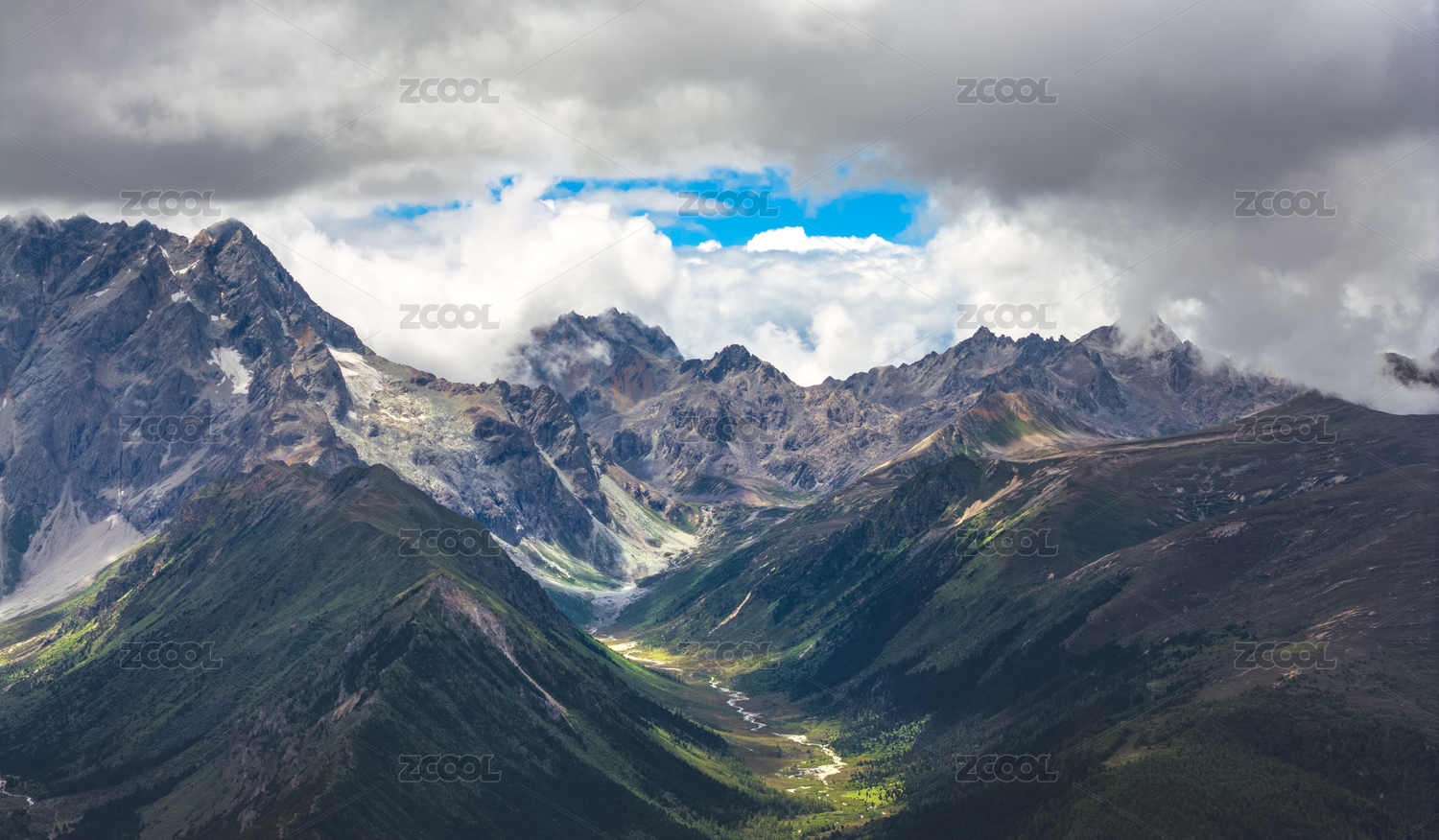 云南白马雪山云雾缭绕的巍峨绿色山谷