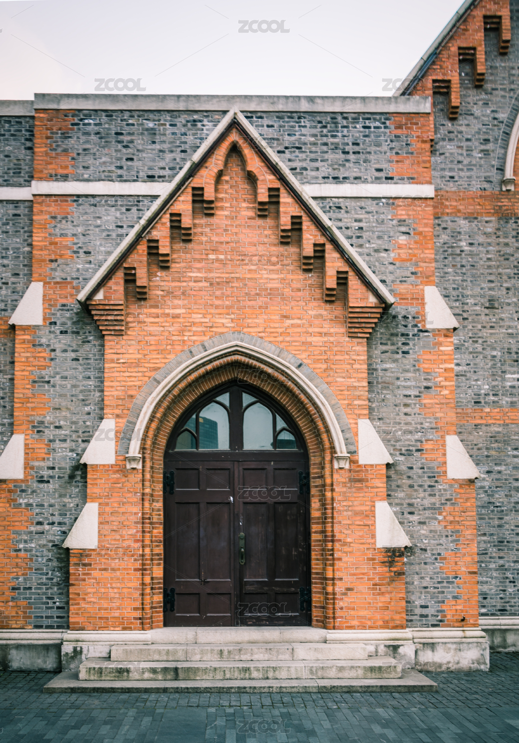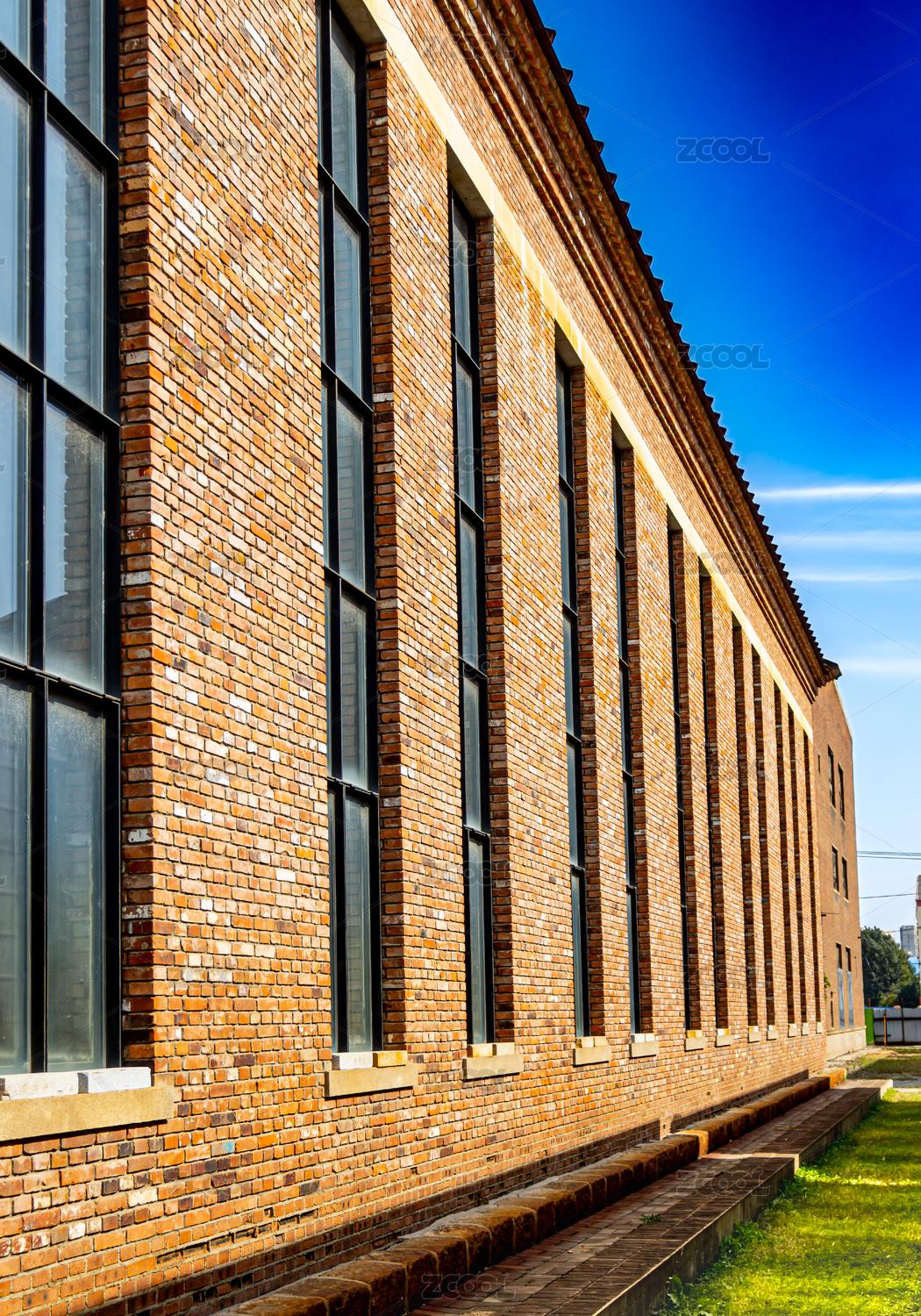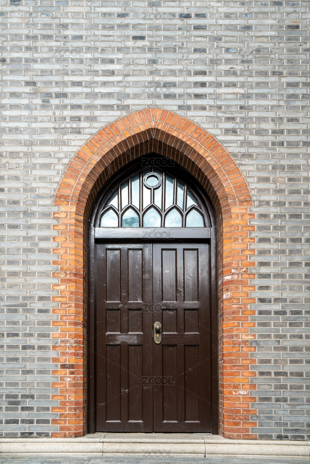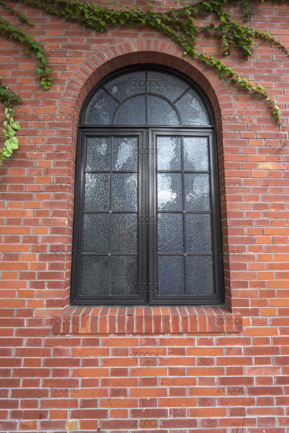 欧式老建筑的红砖墙面及拱形玻璃窗