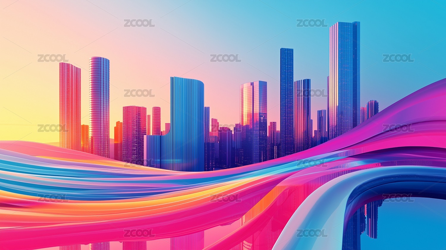 城市与彩色波浪画面