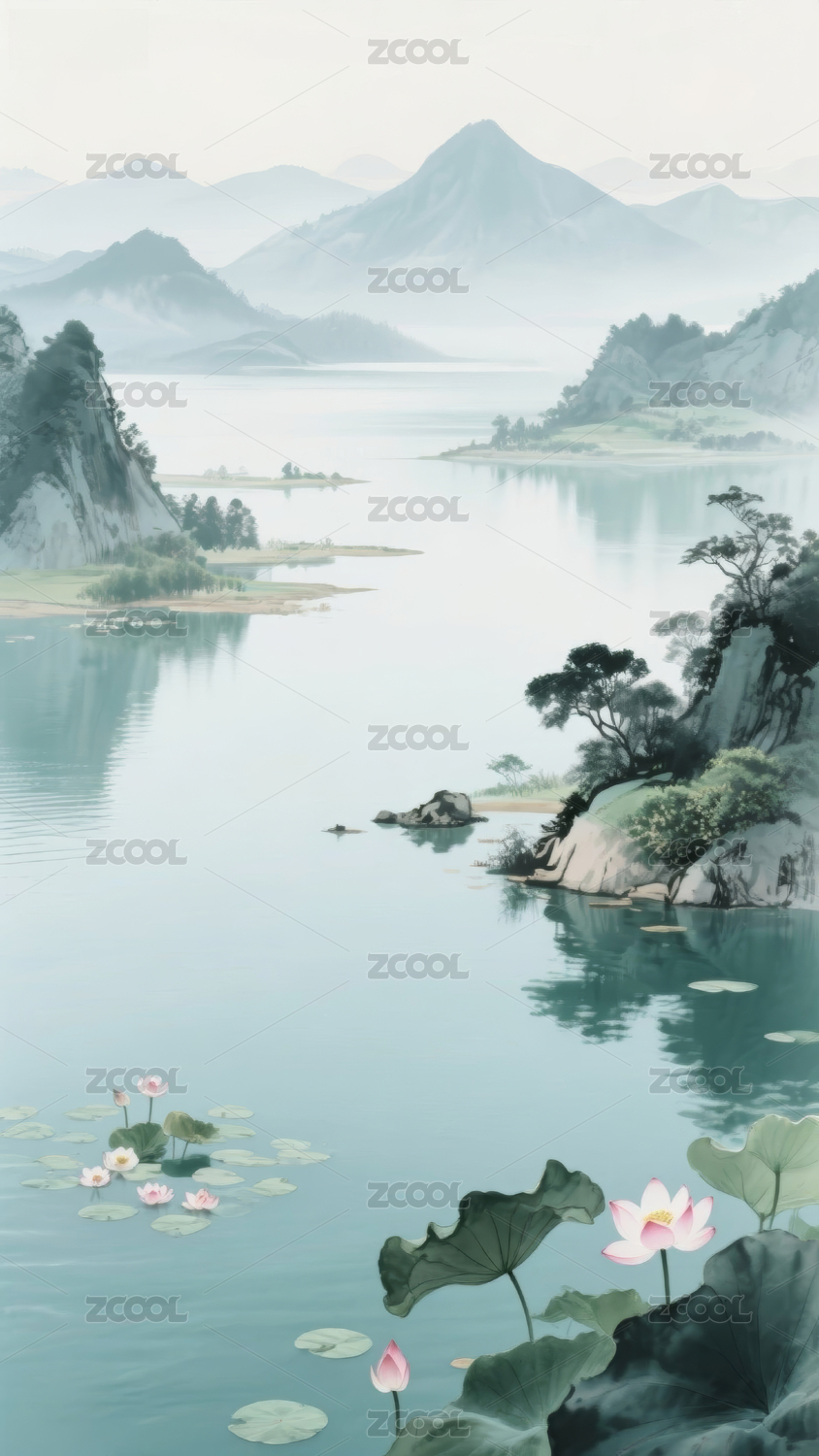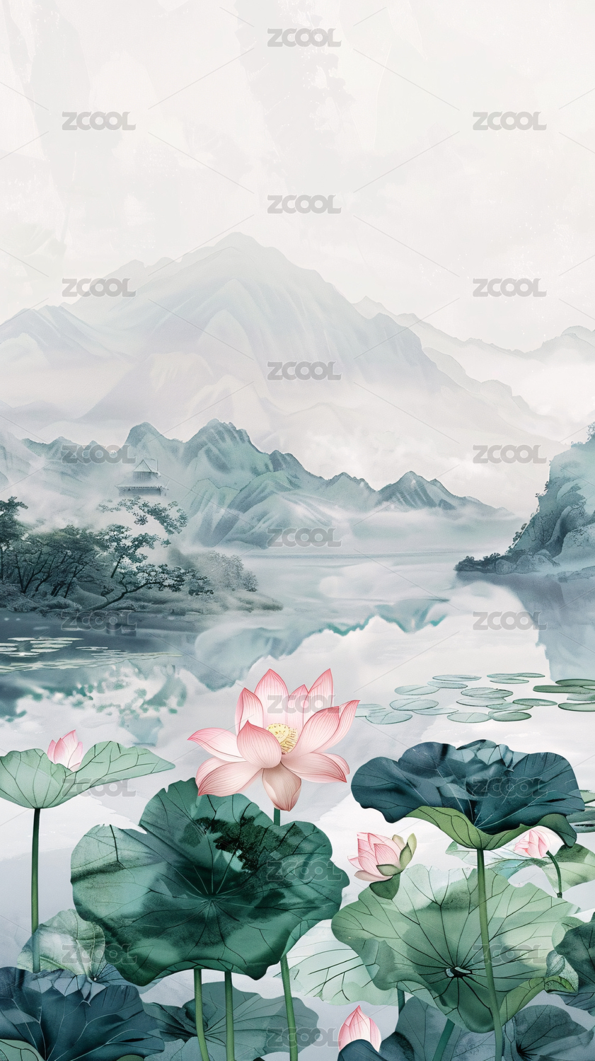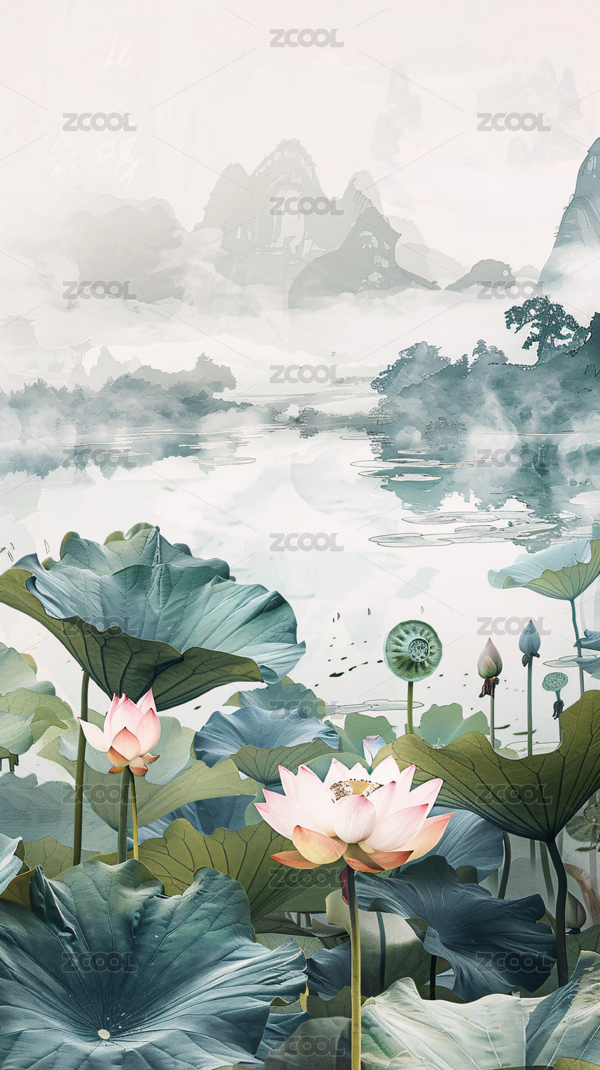 简约清新国风夏天荷花山水背景图片