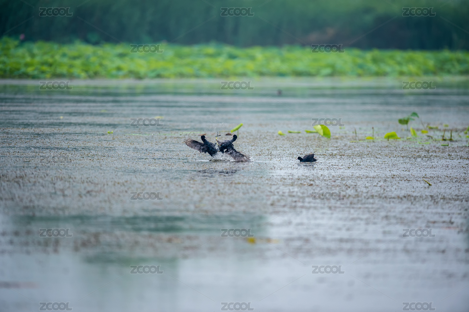 夏季在公园湿地湖泊里栖息觅食的黑水鸡