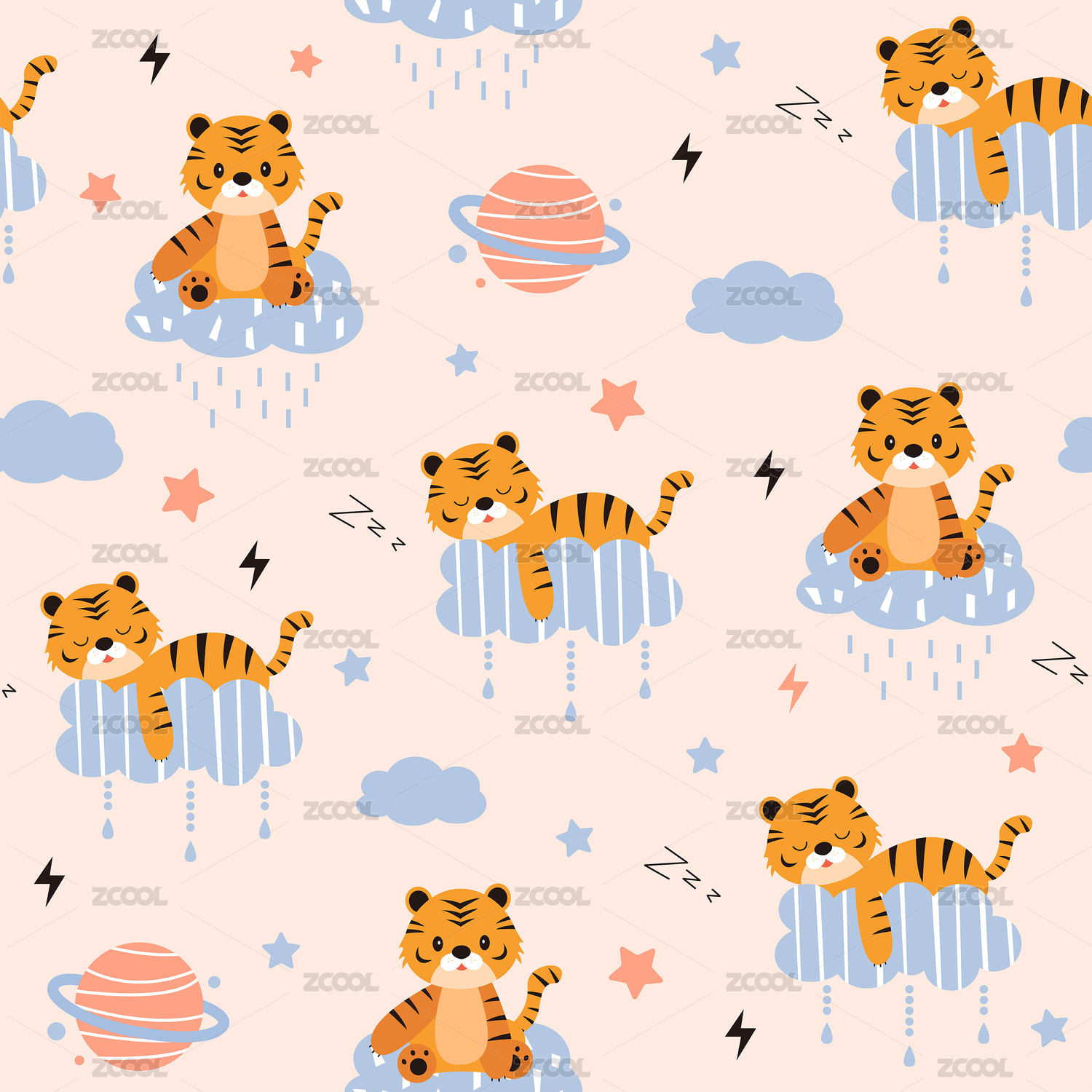 卡通,老虎,太空,漫游,四方连续,矢量,循环,背景,手绘,可爱