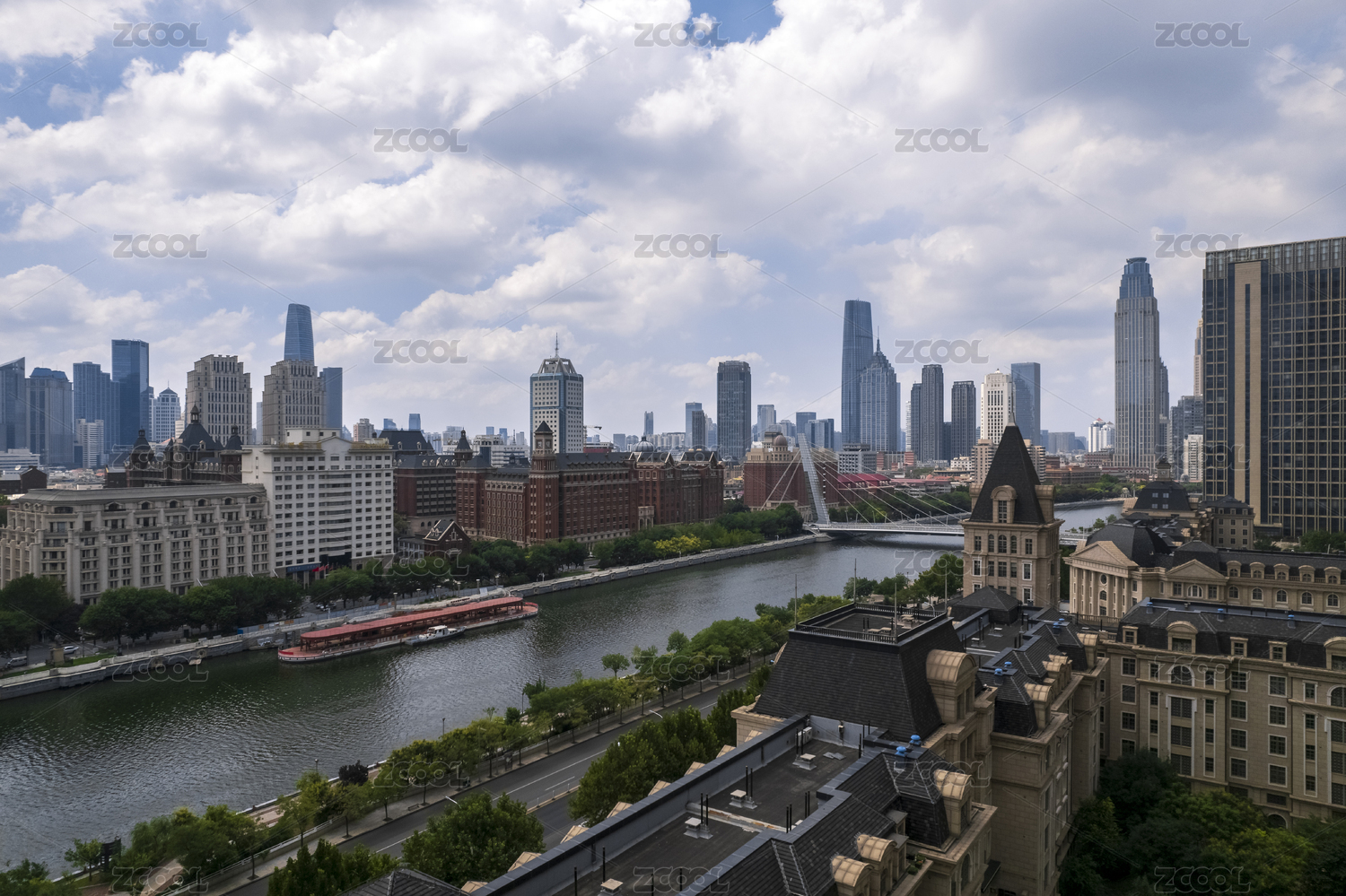 中国天津海河畔保定桥与赤峰桥上空城市风光