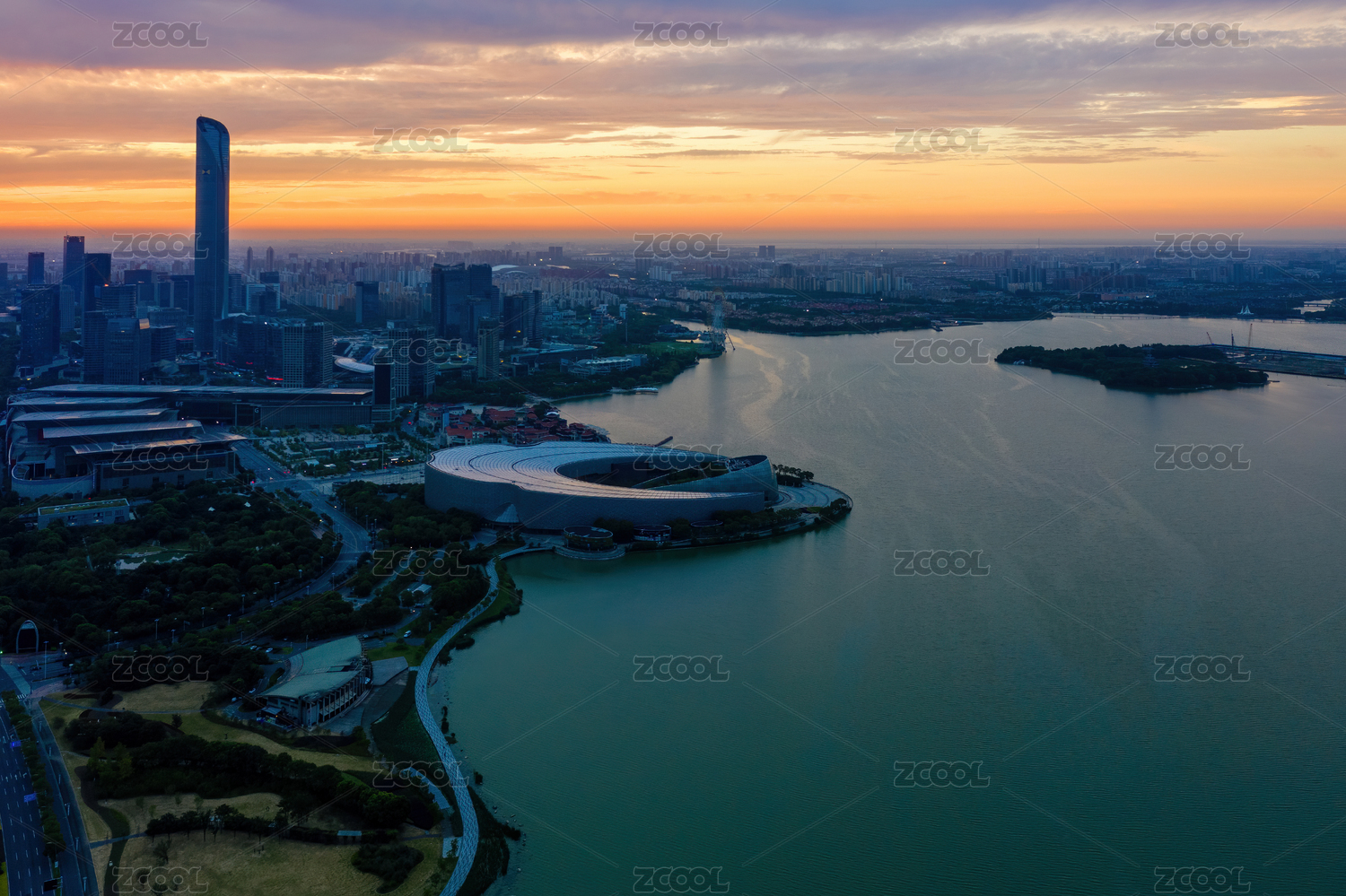 中国江苏苏州金鸡湖凌晨航拍