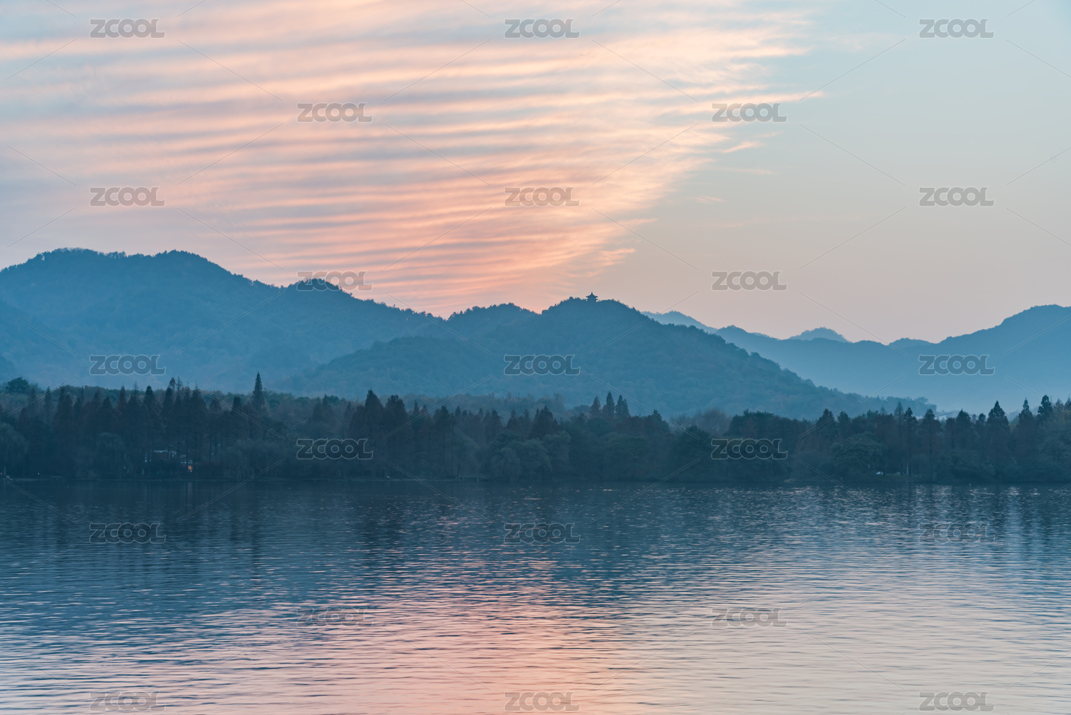 浙江省杭州市一公园附近西湖湖滨日落风光