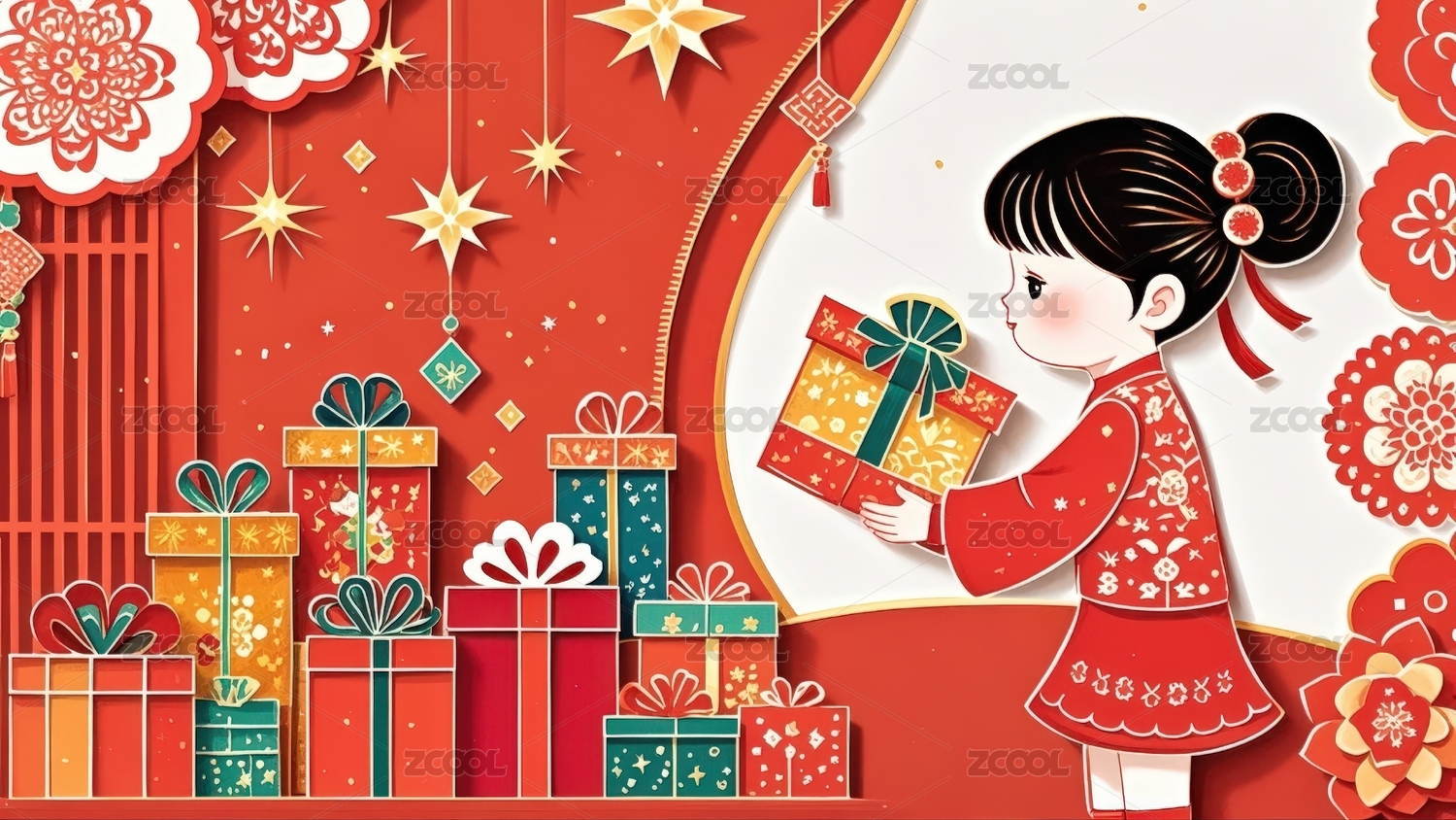 新年,女孩,卡通,可爱,红色,中国风,福字,喜庆,插画,祥和