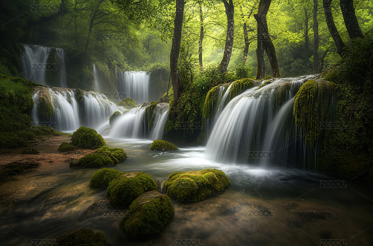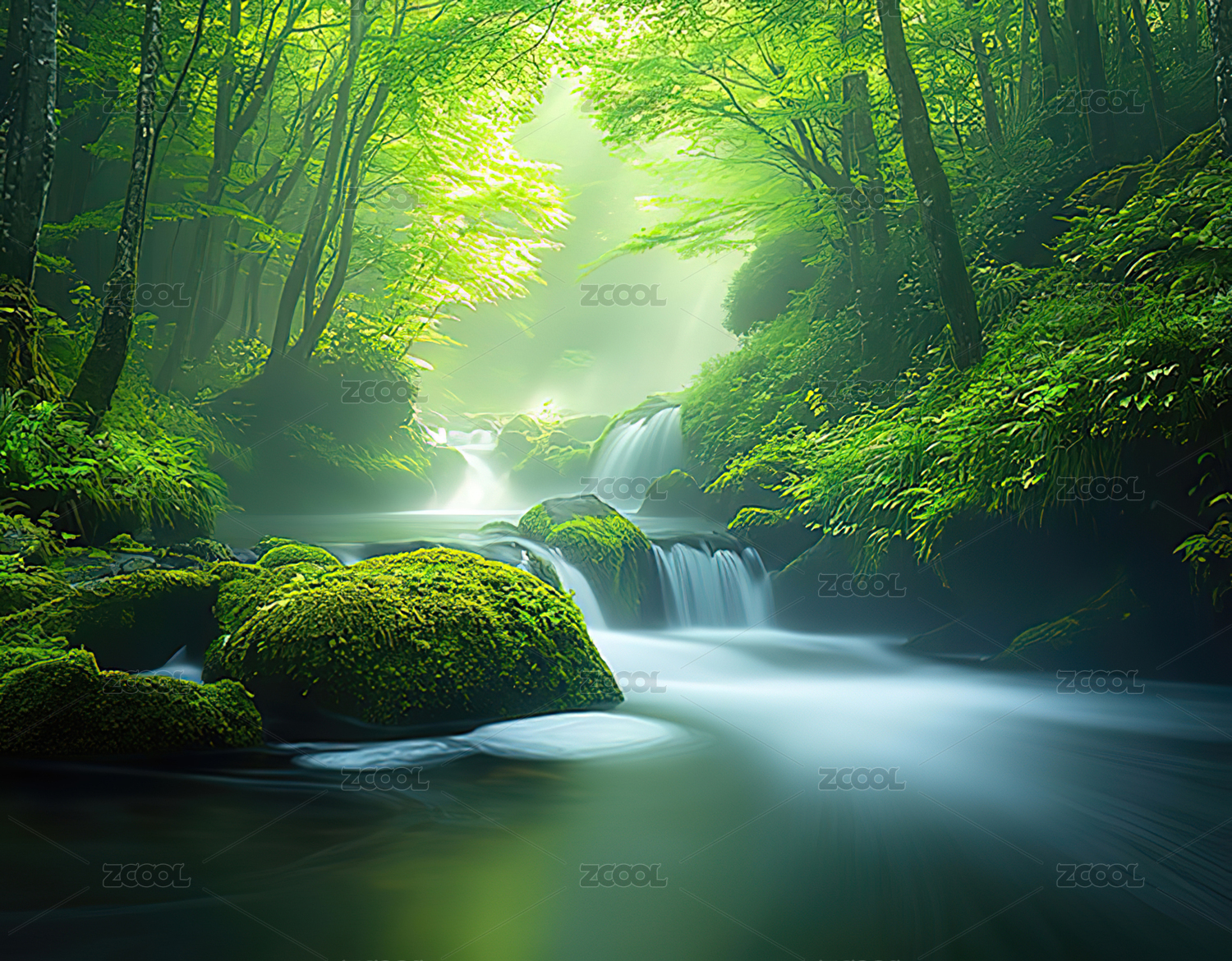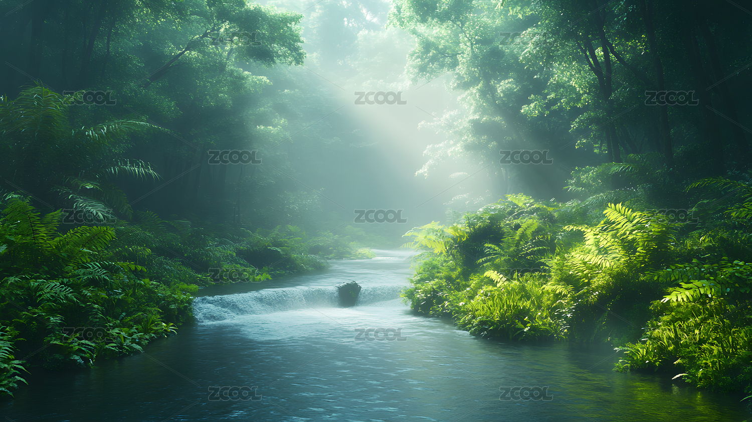 绿意盎然的丛林中缓缓流淌的小溪特写
