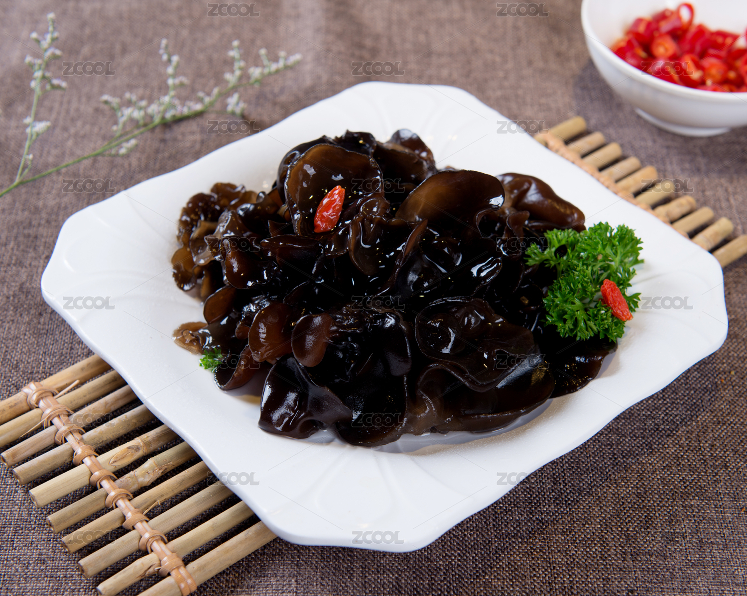 凉拌木耳,中国美食,黑木耳和红辣椒,香菜