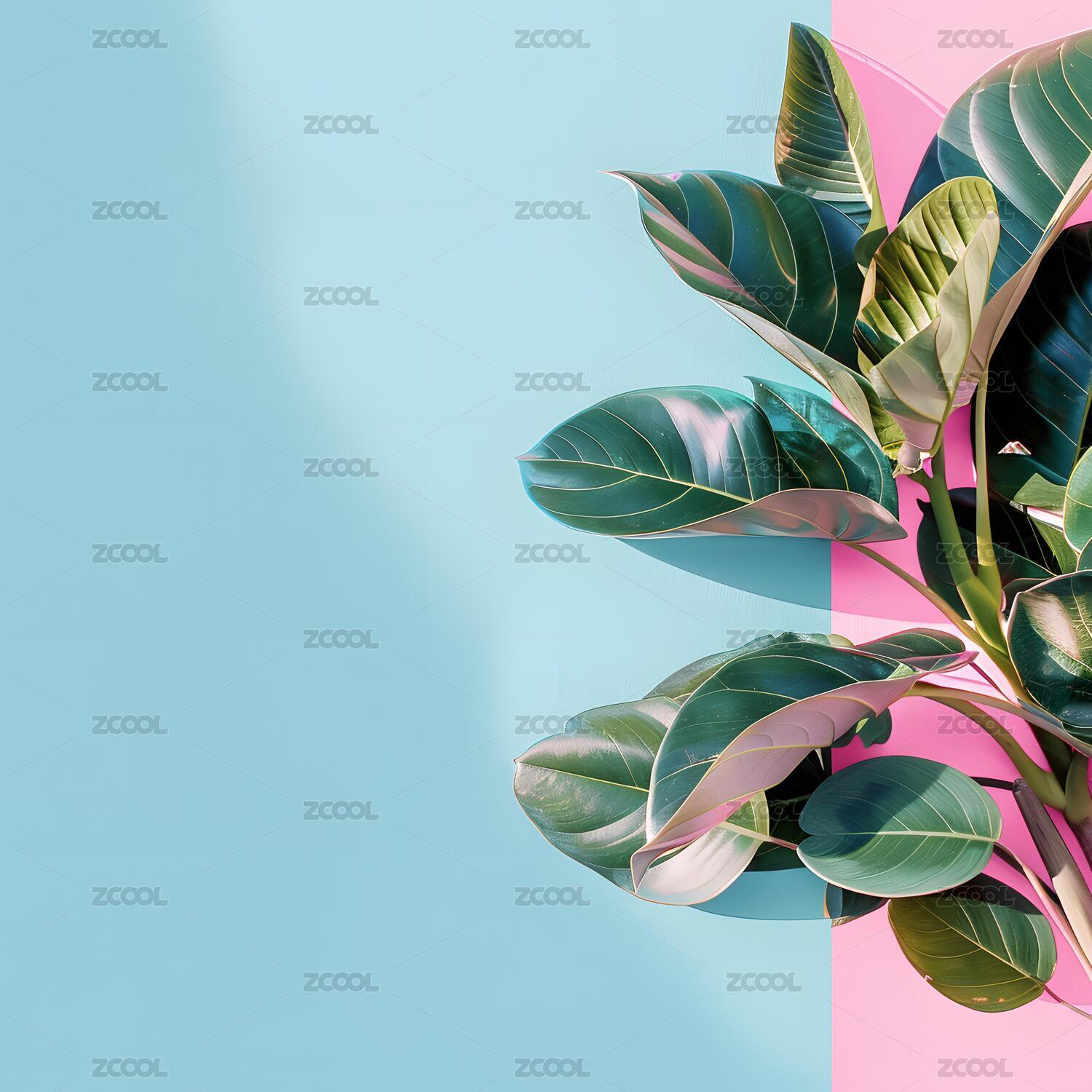 蓝粉色背景上的绿色植物