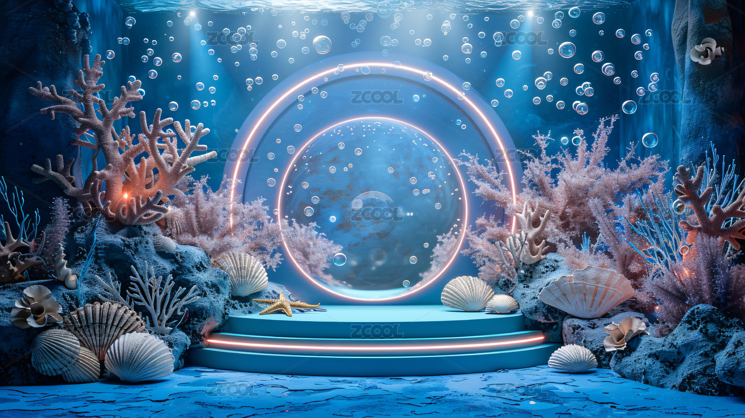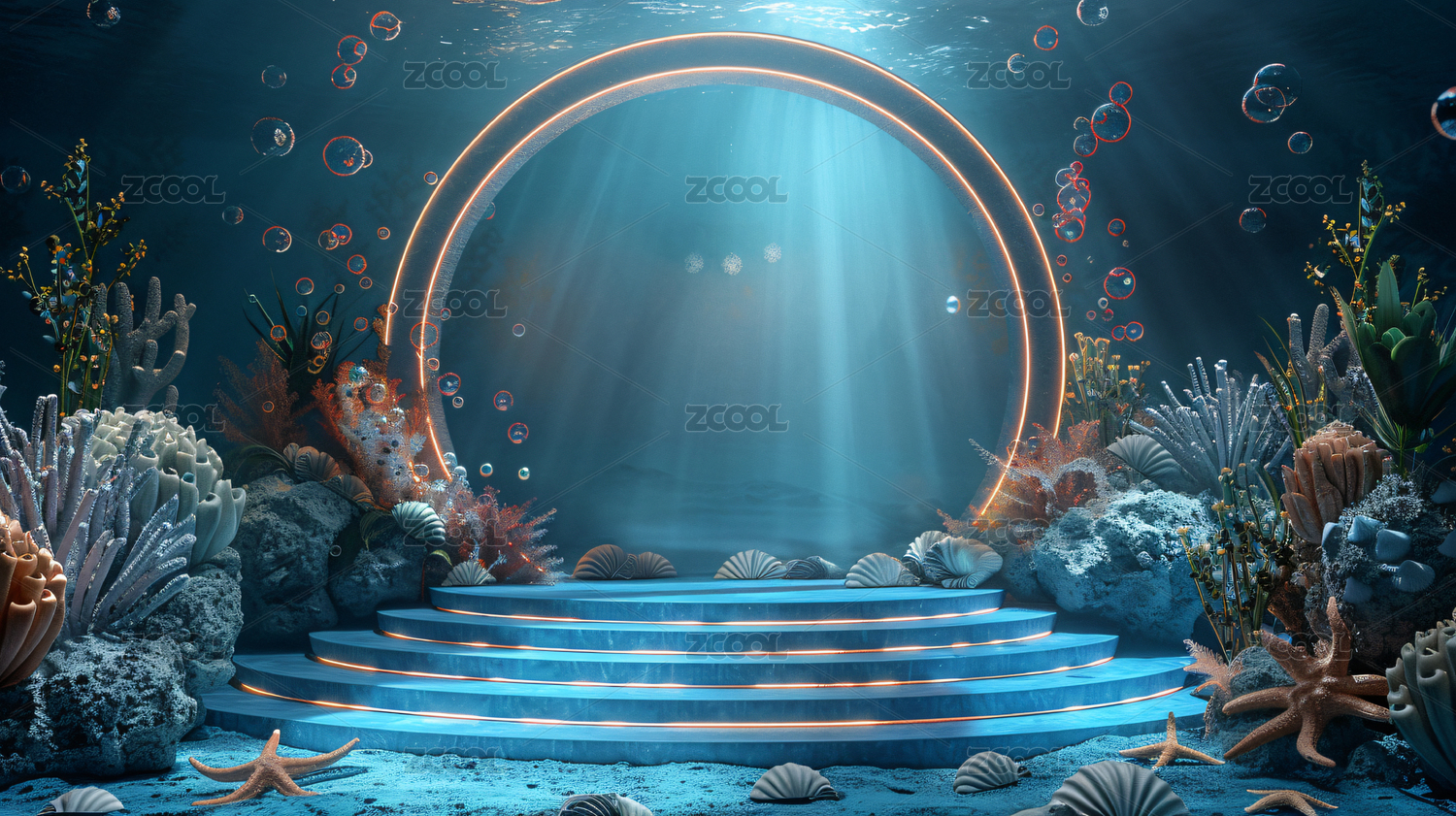 清新清澈水下珊瑚围绕圆型展台3D立体插画