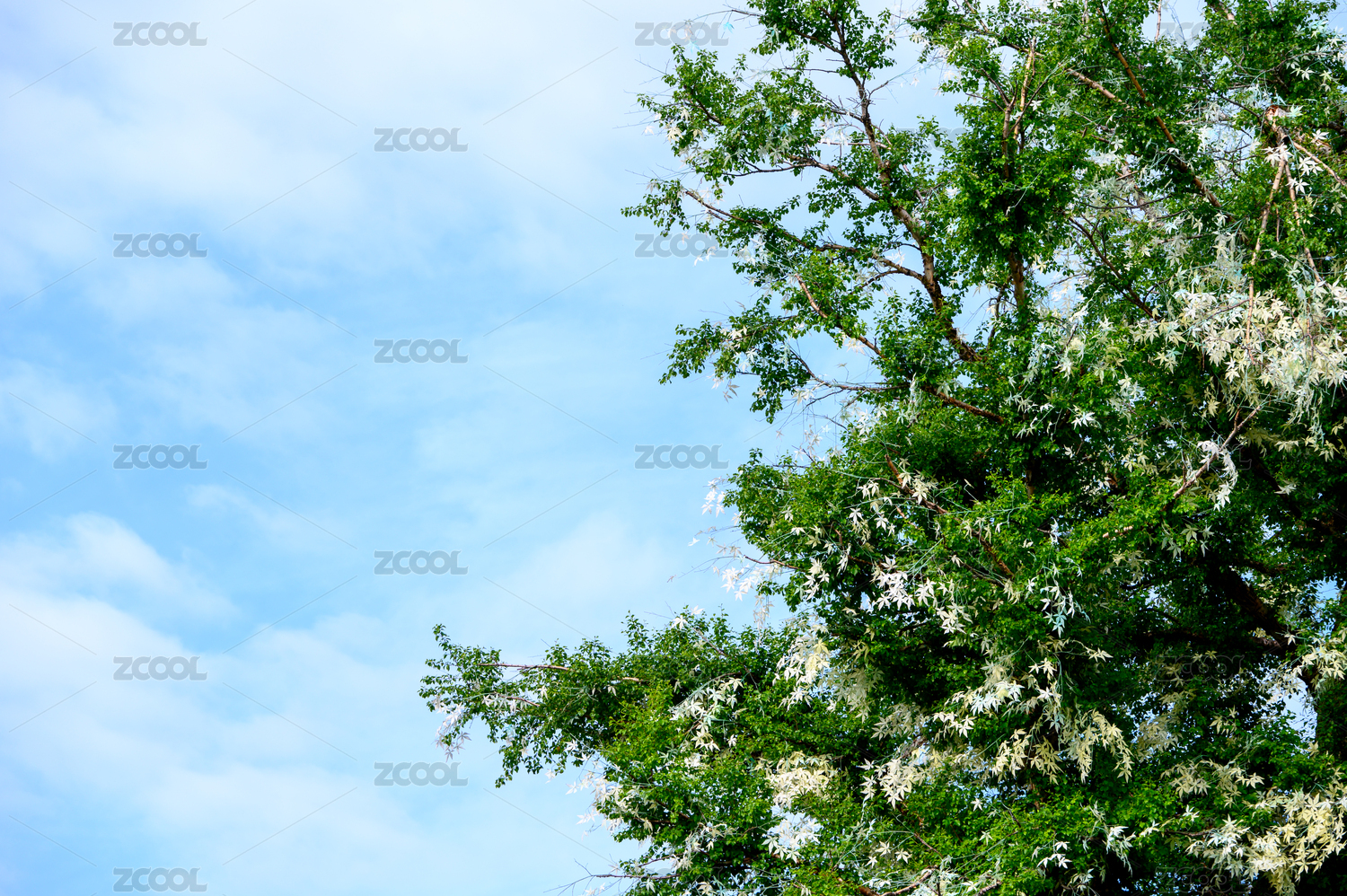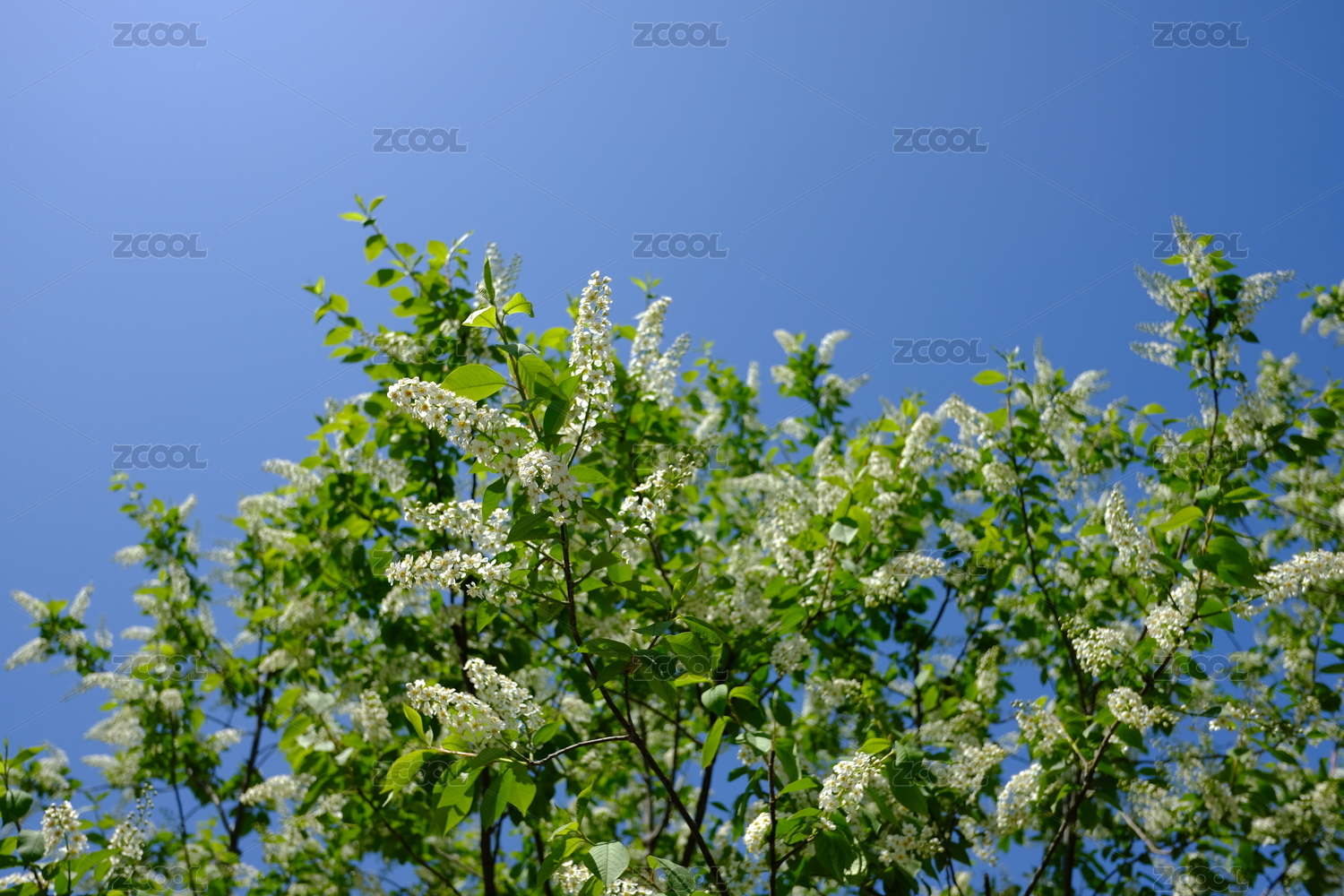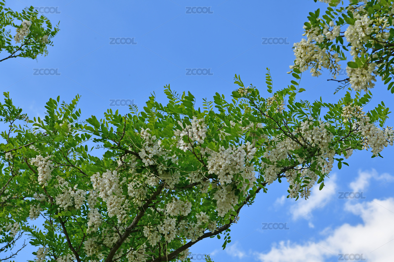 仰拍夏天里五月盛开的槐花