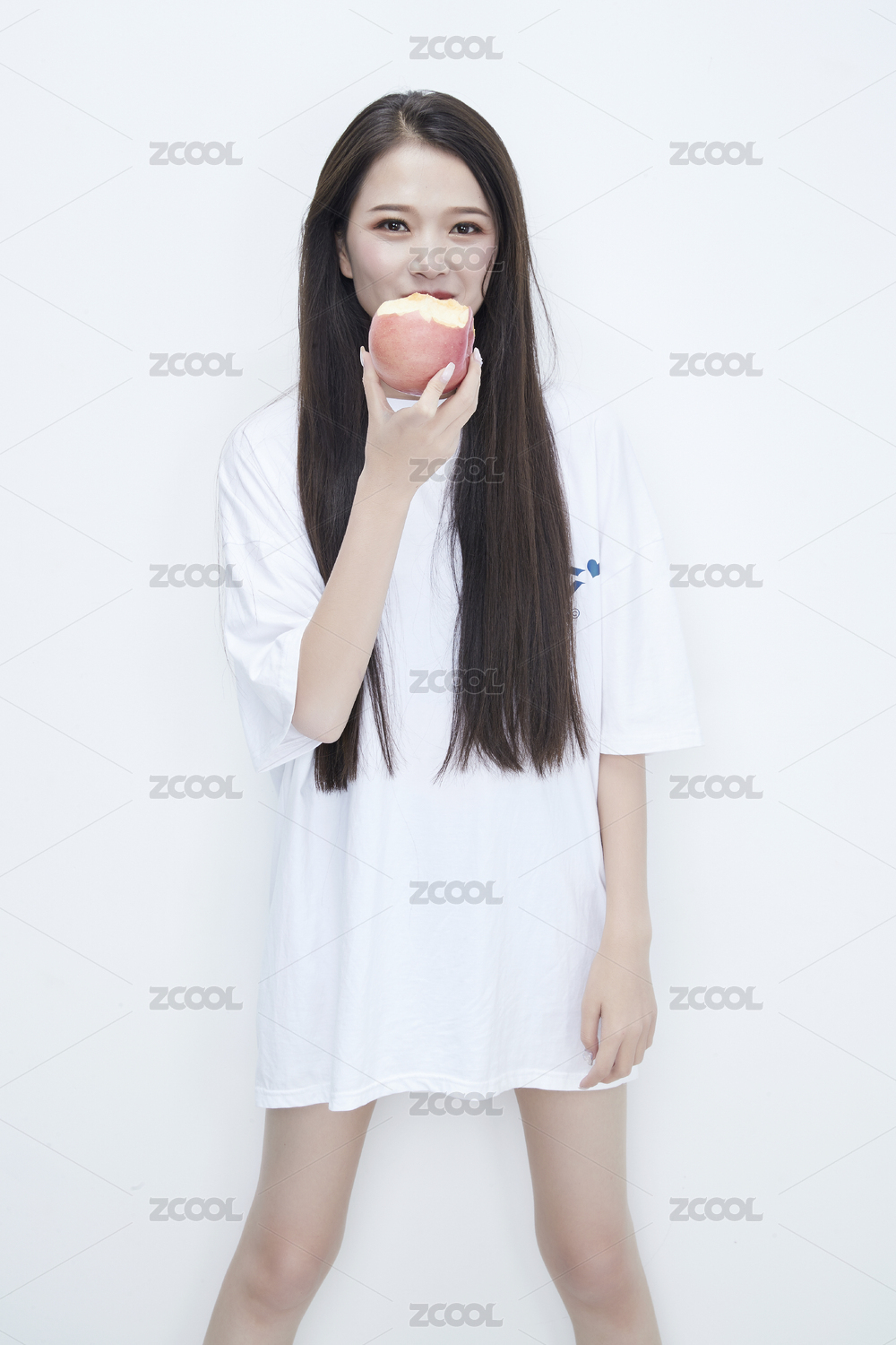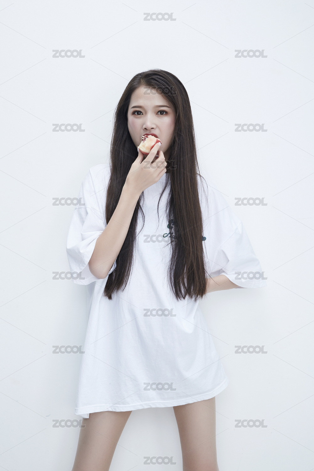 吃苹果的穿白色长T血衫的长发可爱少女人像