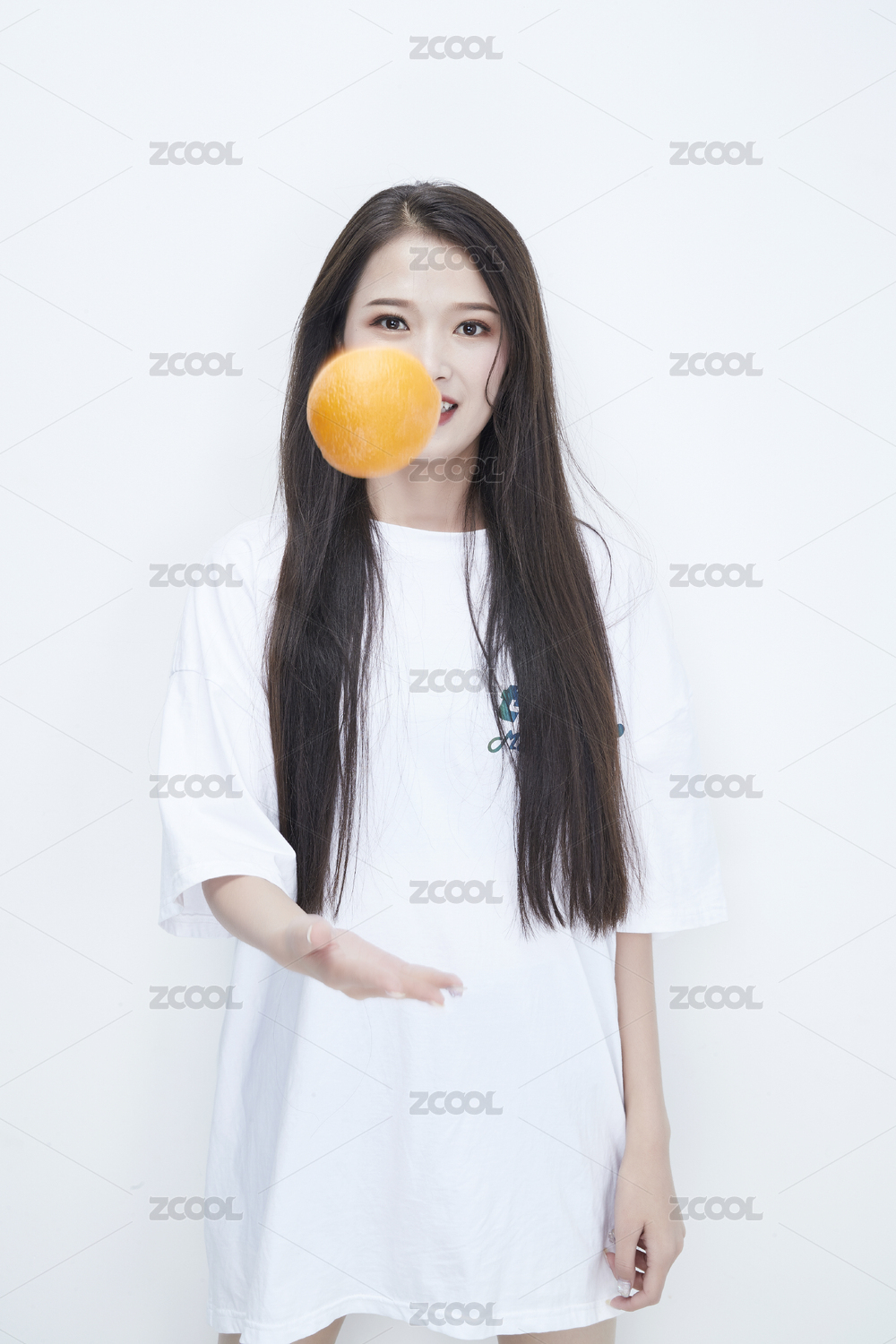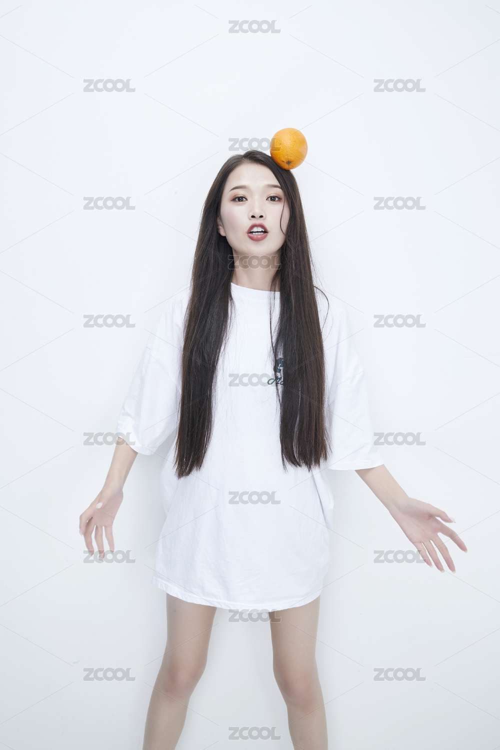 头顶橙子穿白色长T血的亚洲可爱少女人像