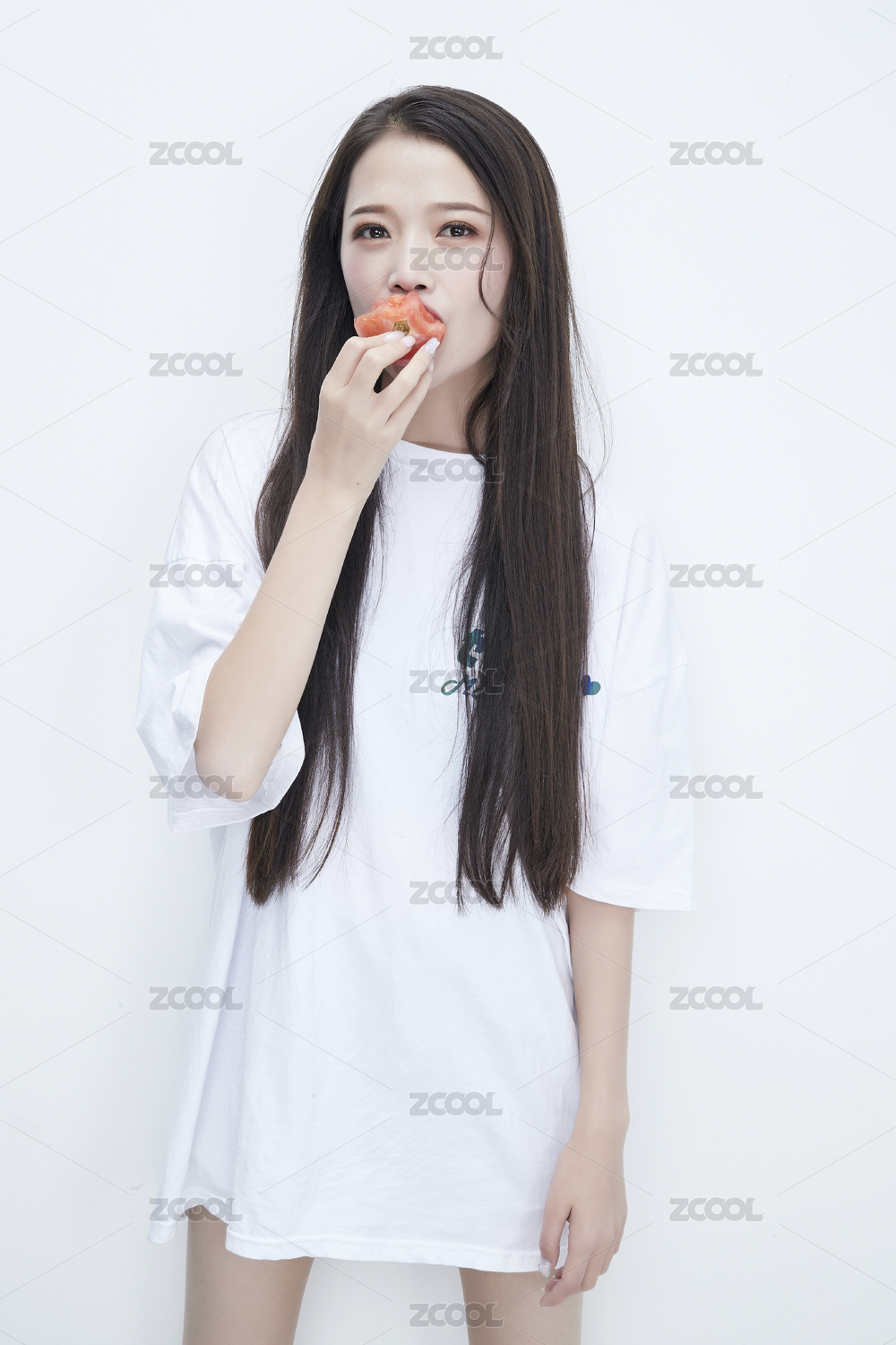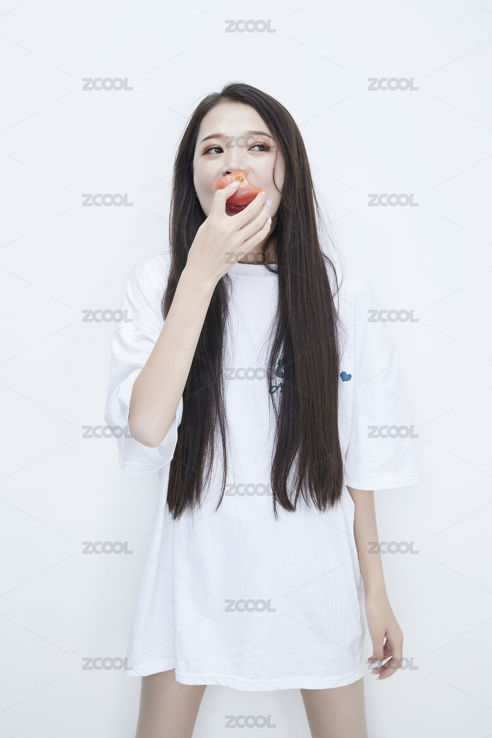 吃番茄的身穿白色长T血衬衫的长发少女人像