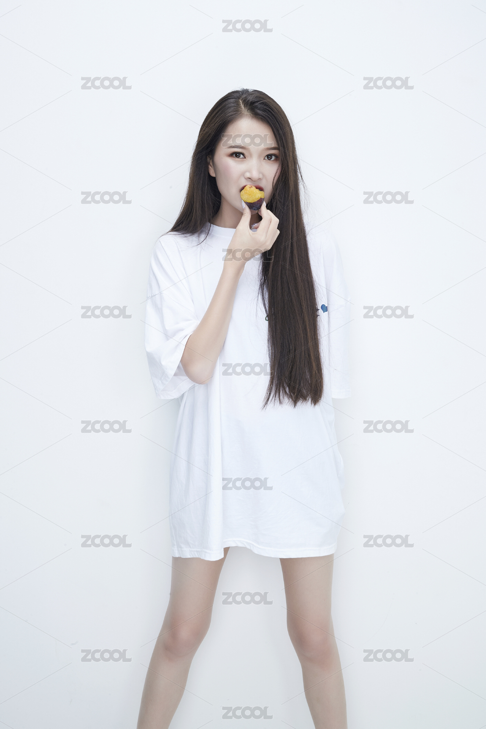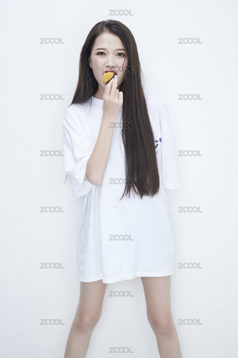 吃水果的身穿白色长T血衬衫的长发少女人像