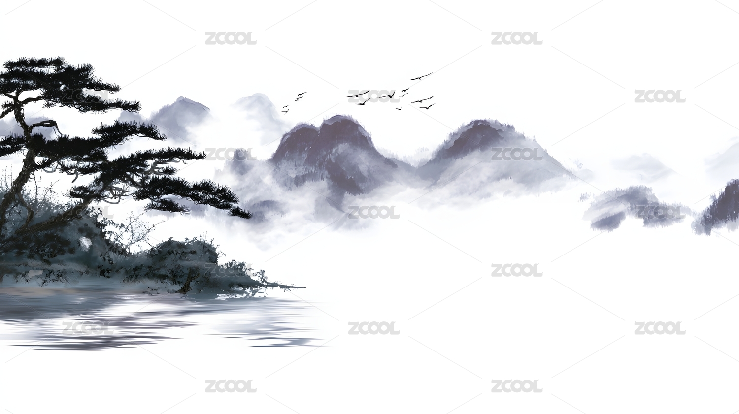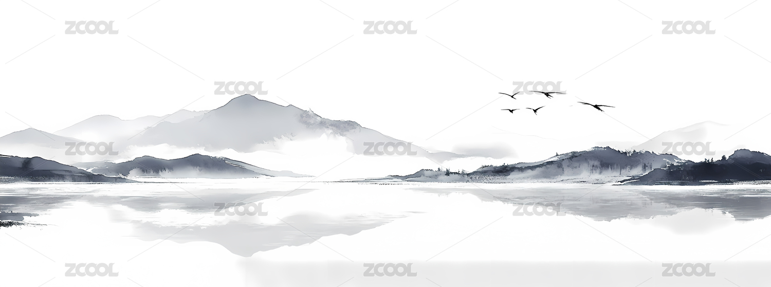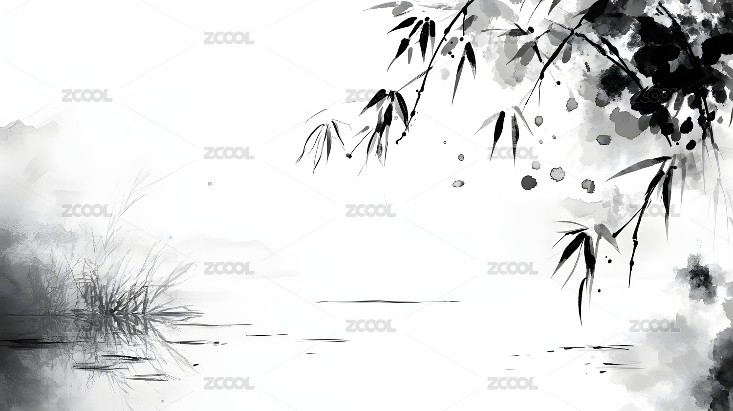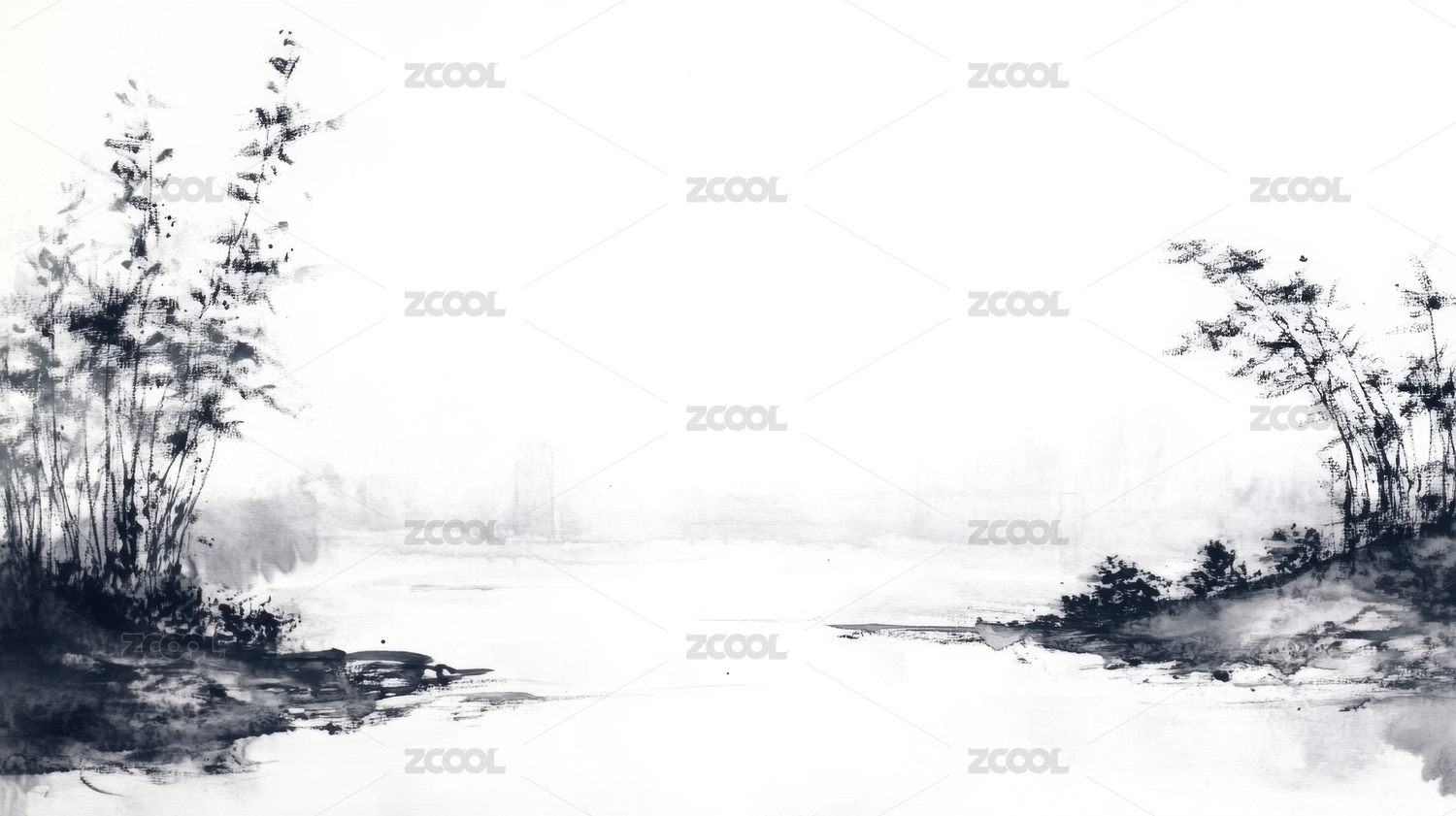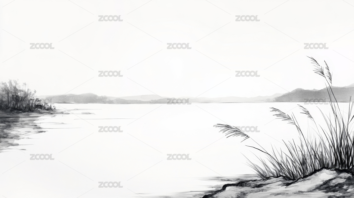 湖水,山峦,芦苇,宁静,自然,水墨画,黑白,简约,风景,艺术