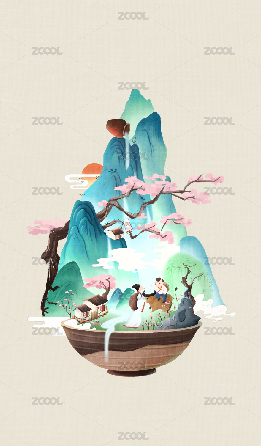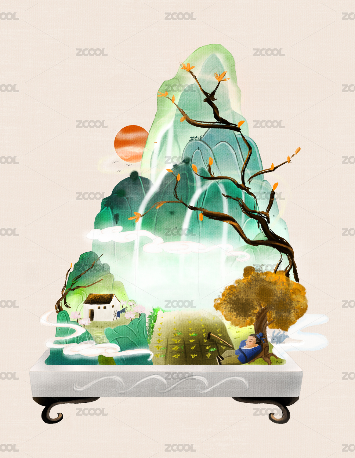 中国古风水墨微观山水场景草木丛生繁花盛开