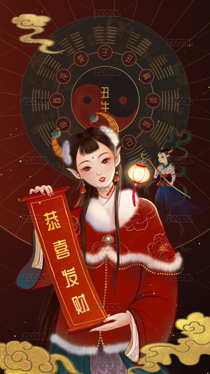 国潮风节日快乐恭喜发财美女财神中国娃娃