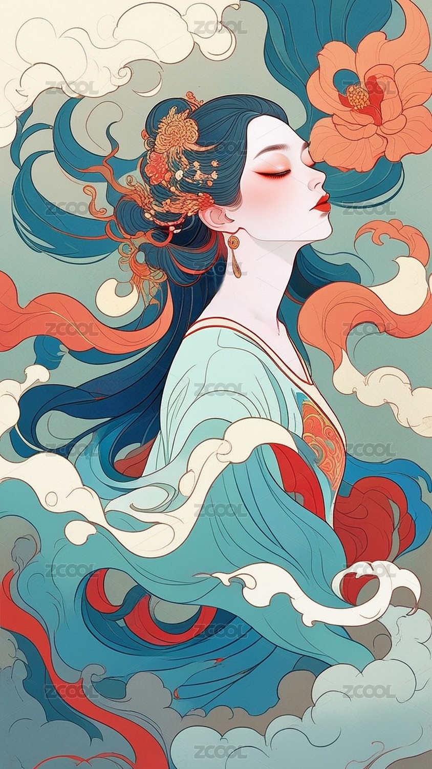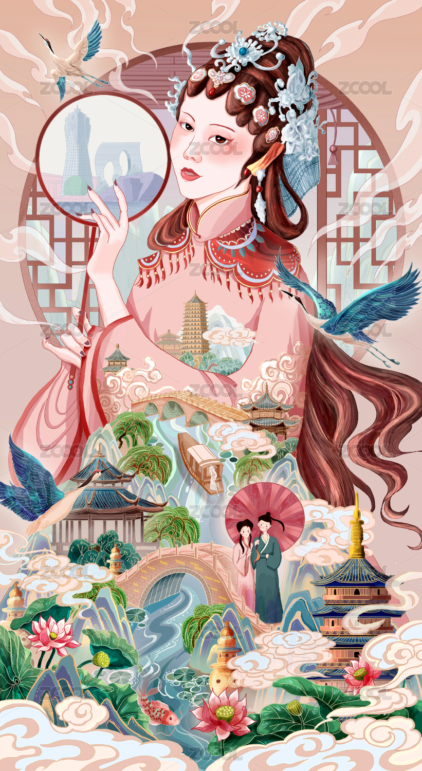 牡丹喜鹊祥云围绕着穿着旗袍的女孩