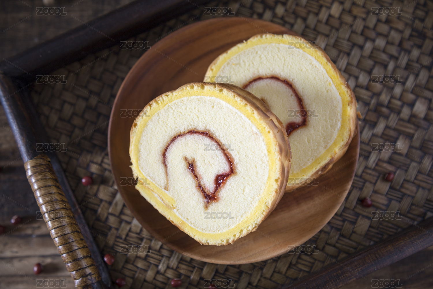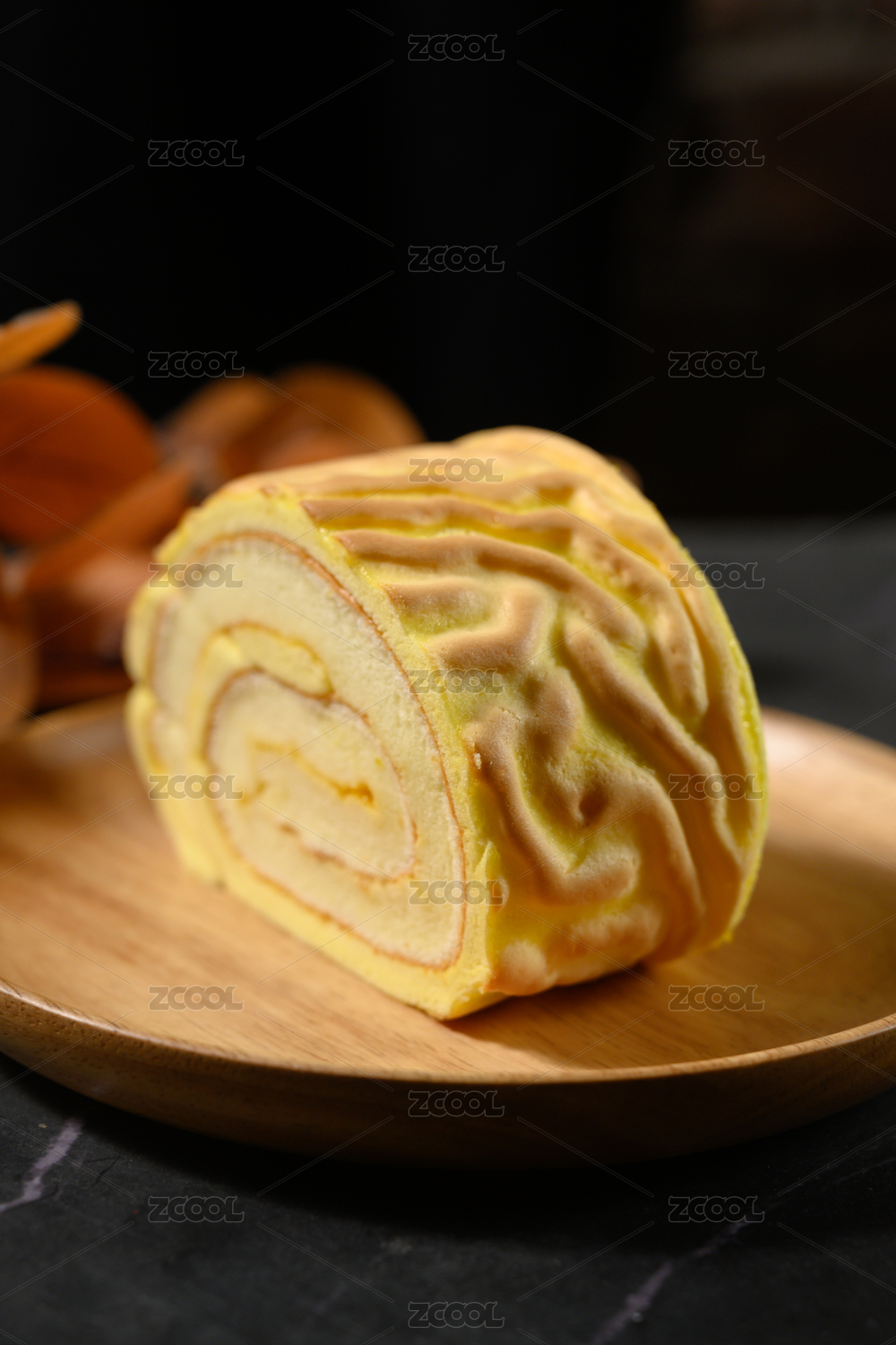 桌面上的盘子里的美味可口的虎皮蛋糕卷