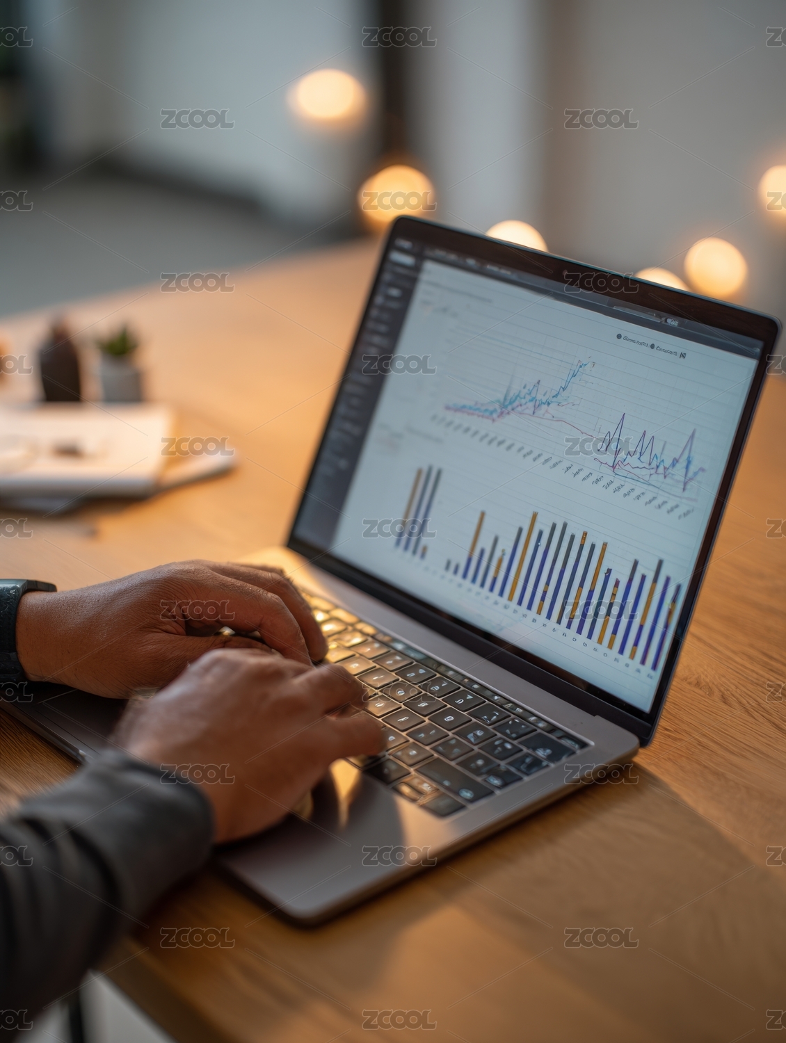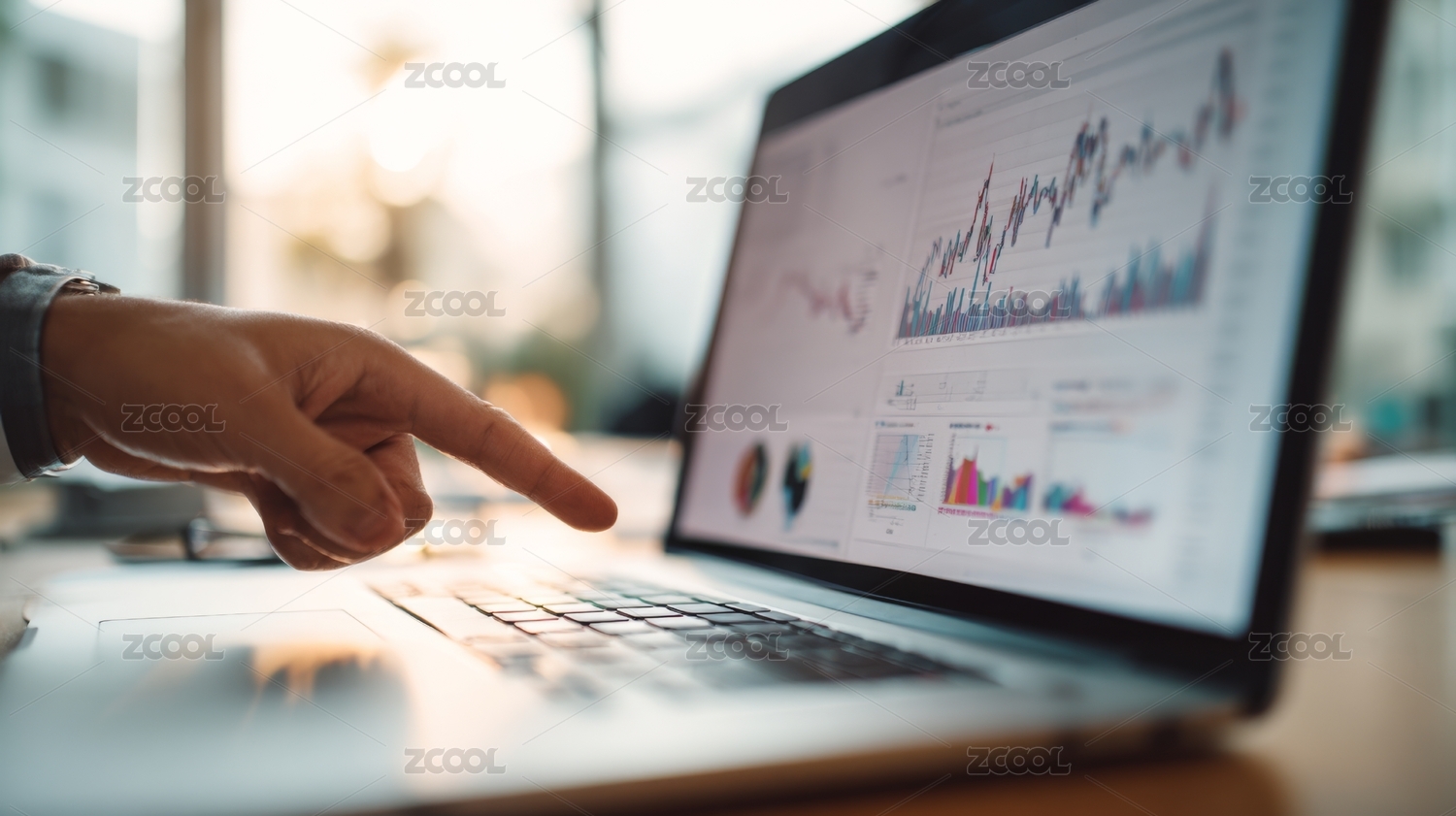办公主题白领女性在咖啡馆落地窗边上边喝咖啡边在笔记本电脑上工作制作图表
