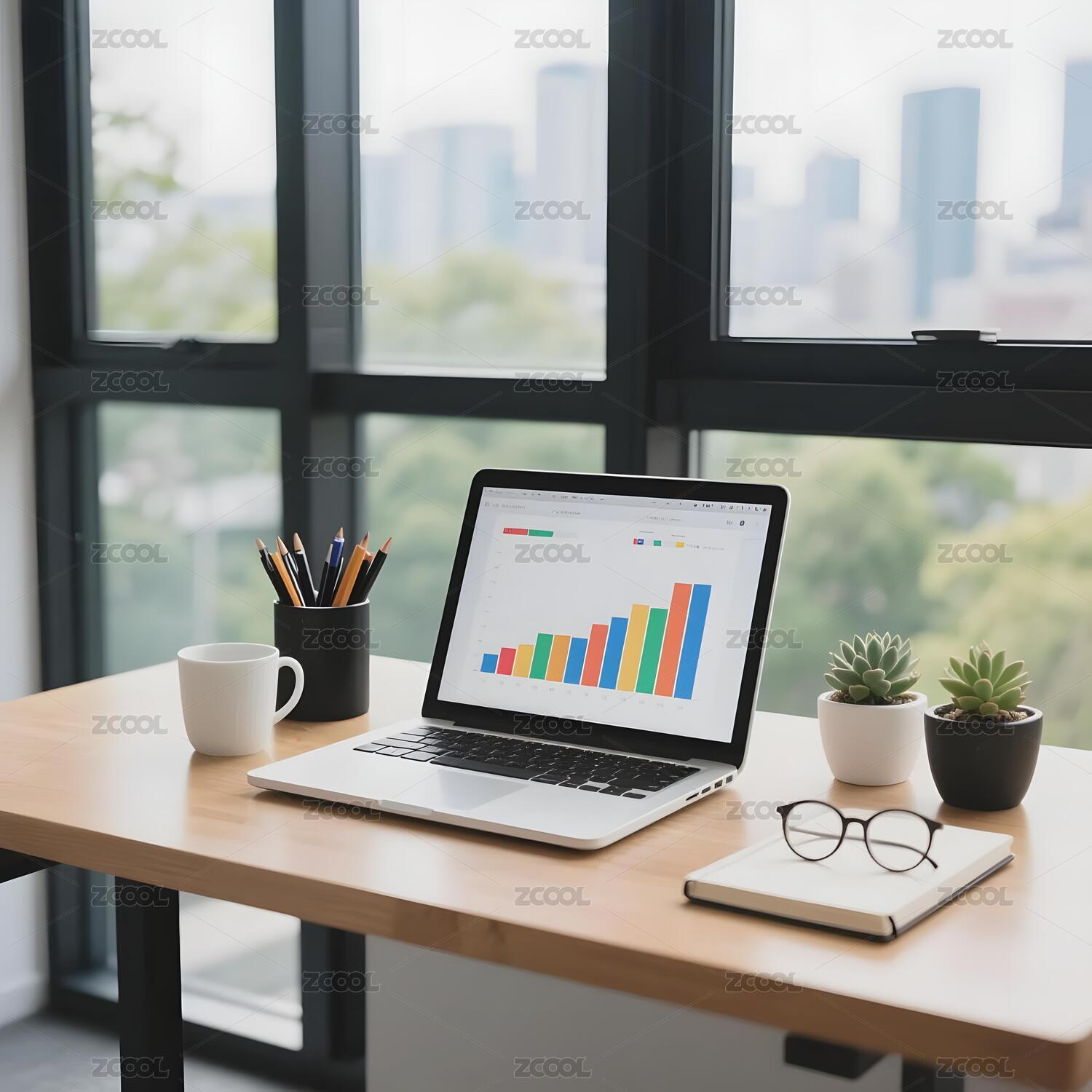 办公主题白领女性在咖啡馆落地窗边用笔记本电脑工作制作图表