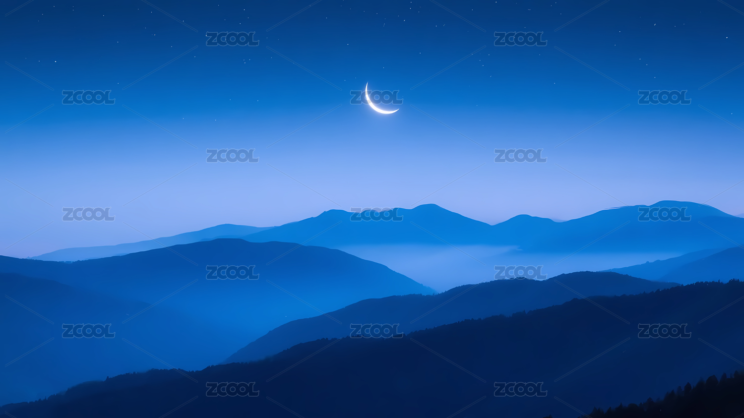 弯月山峦深蓝色夜空