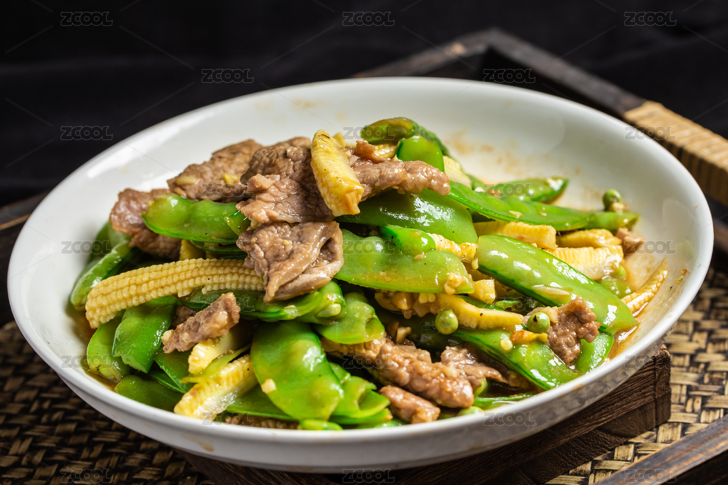 白色碟子里的豌豆荚炒牛肉