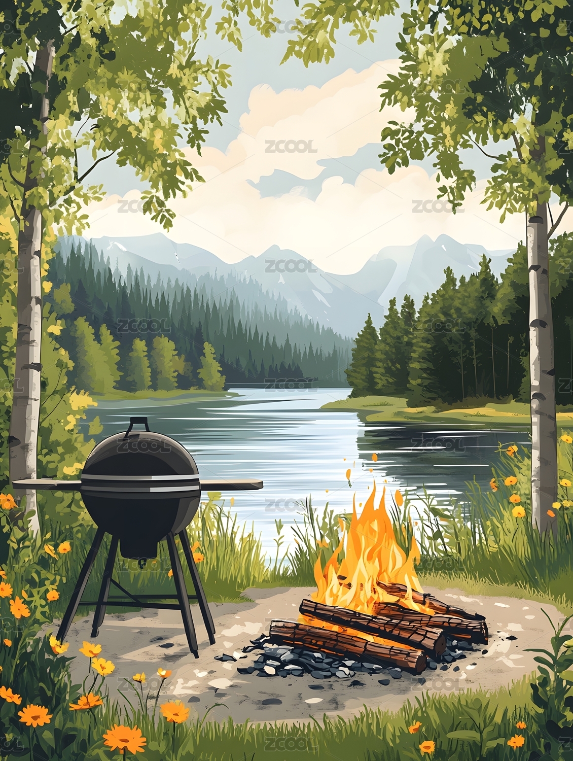 野餐,烧烤,背景,bbq,户外,插画,草地,森林,夜晚,火焰