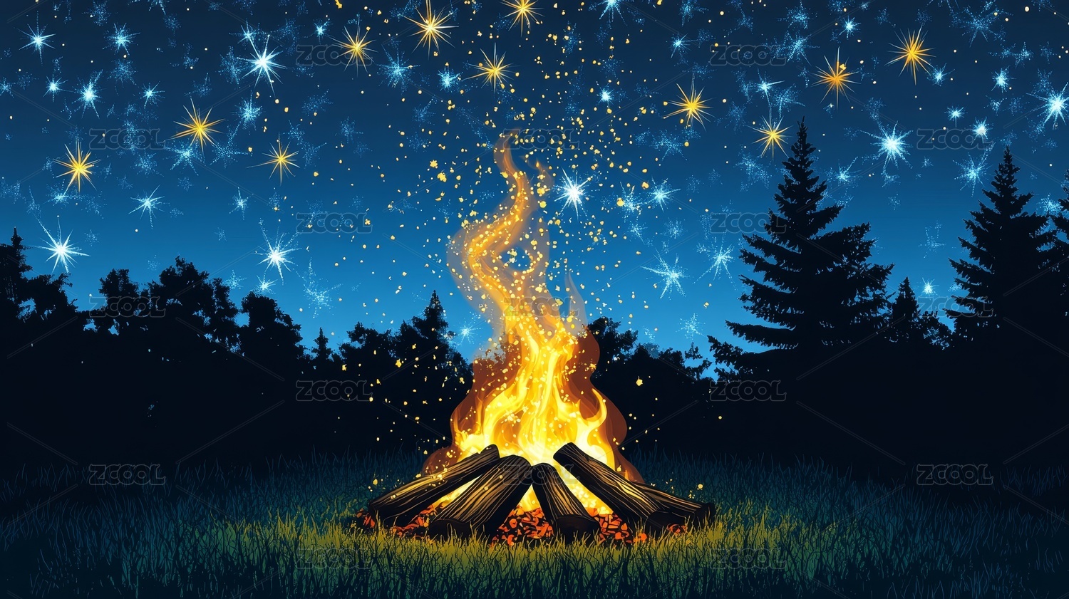 夜晚森林篝火闪烁图