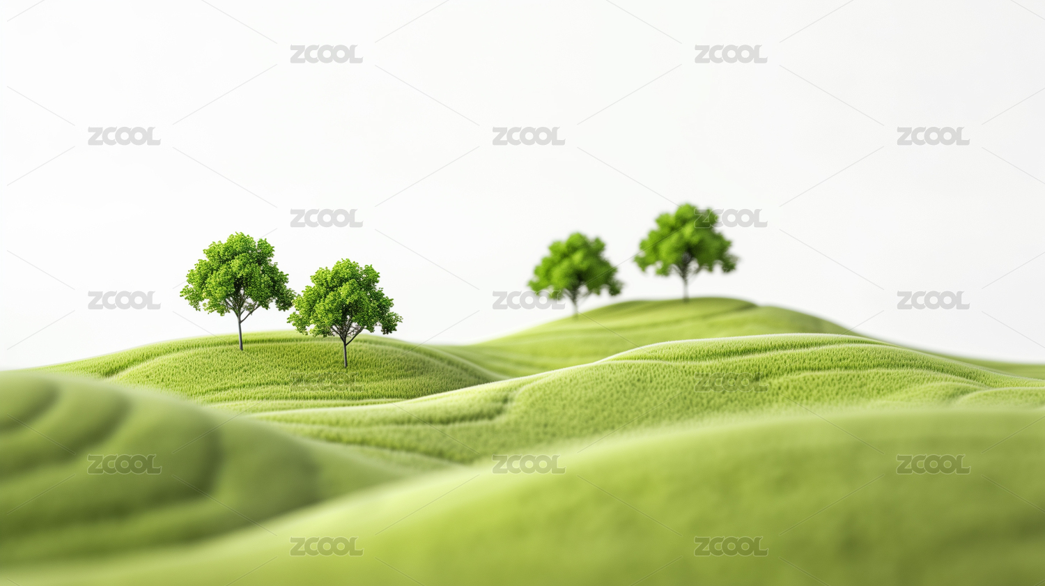 绿色小山丘点缀着几棵树木