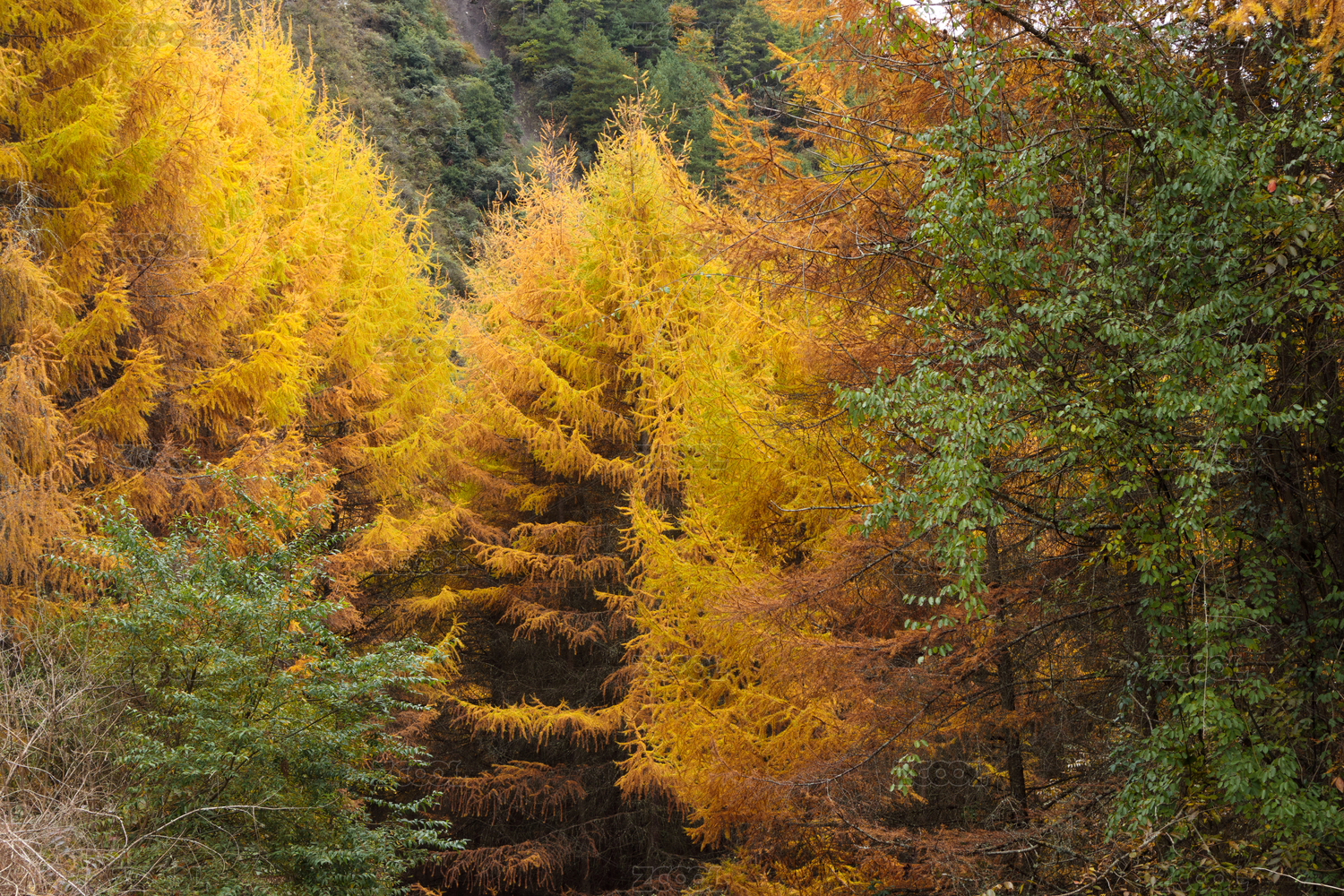 秋日山间金黄的落叶松红杉树