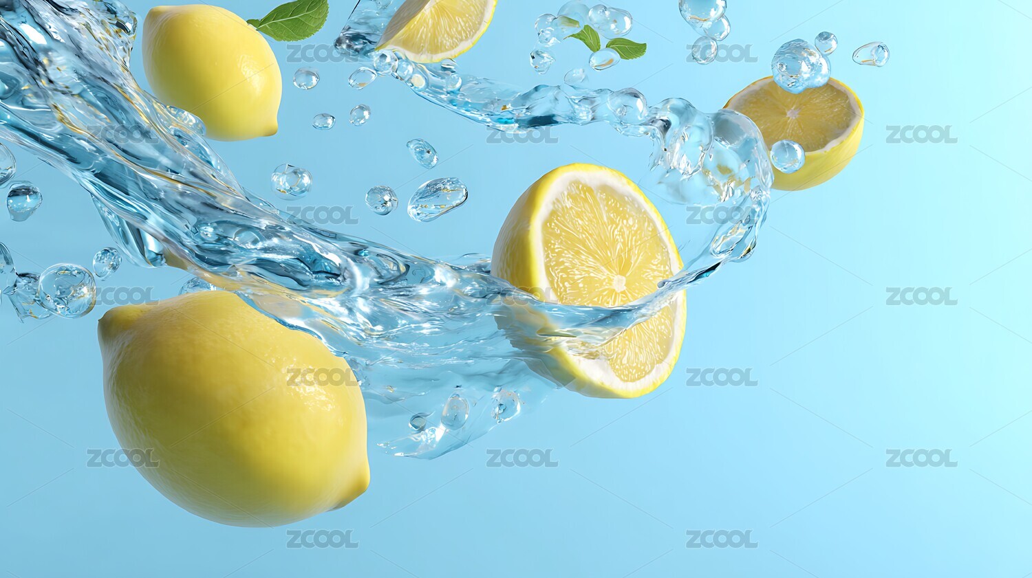 蓝色水花水珠柠檬凉爽夏天3D插画
