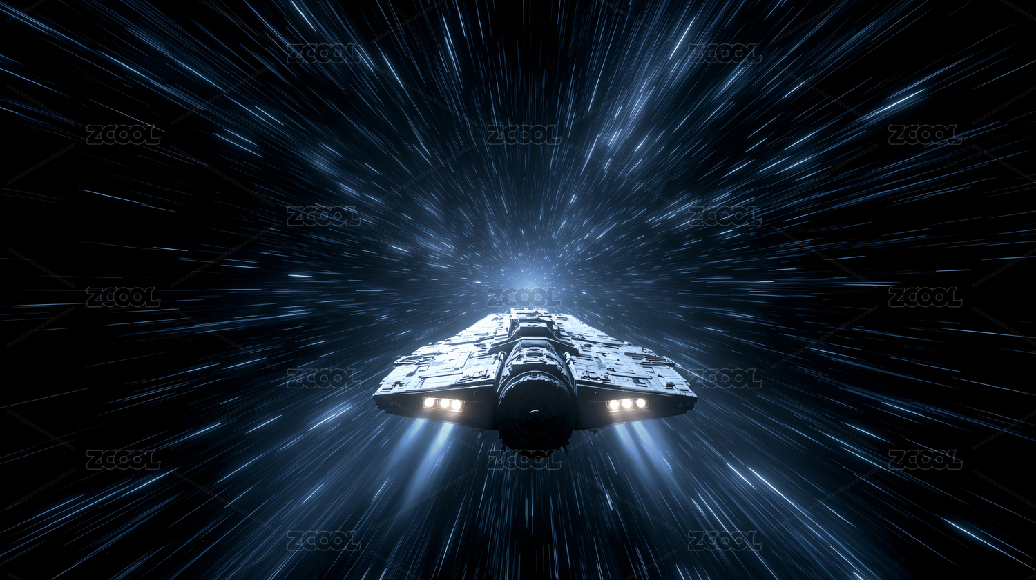 蓝色星际飞船疾驰穿梭,红色光芒映照宇宙