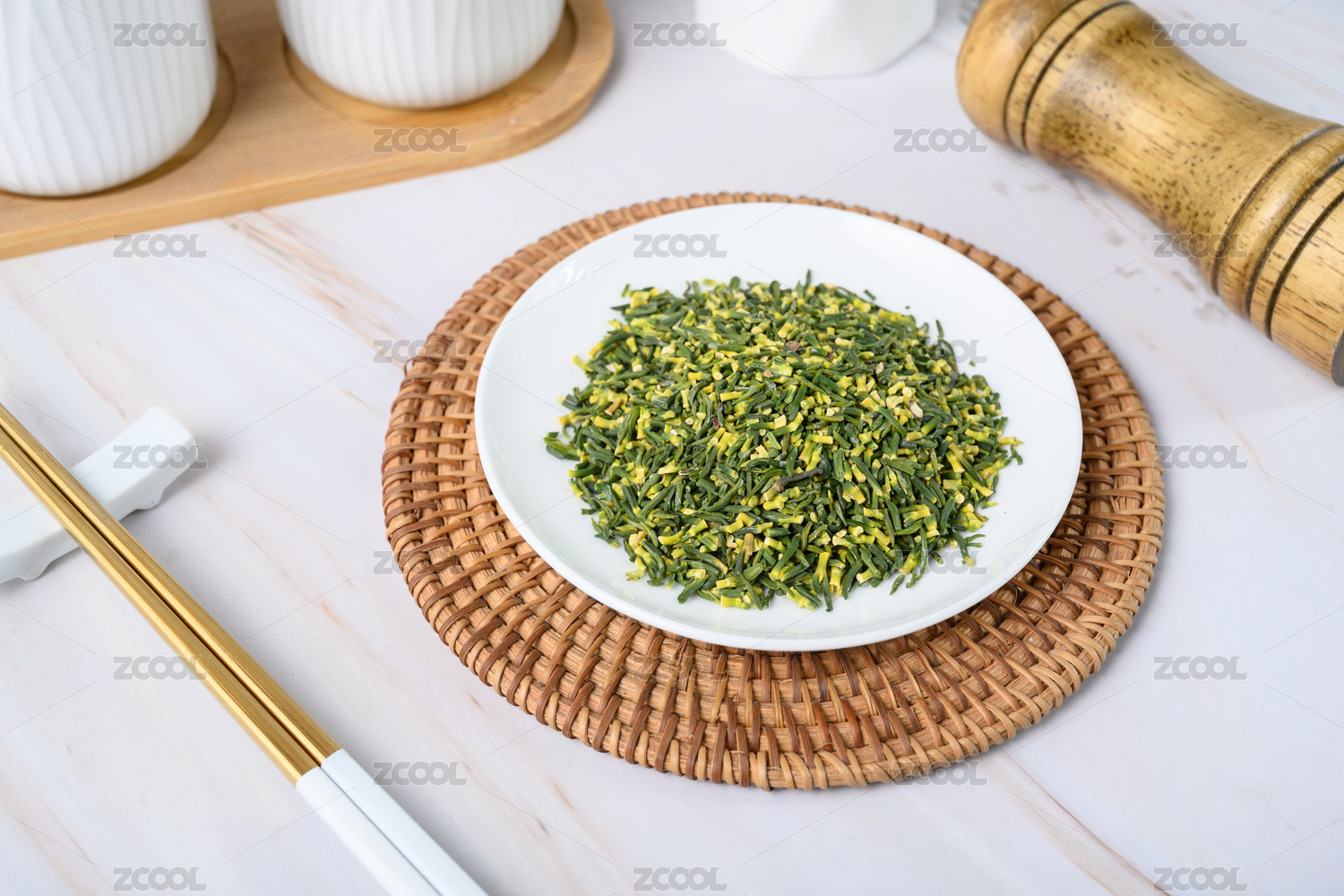 桌面上的盘子里的美味可口的香菜干