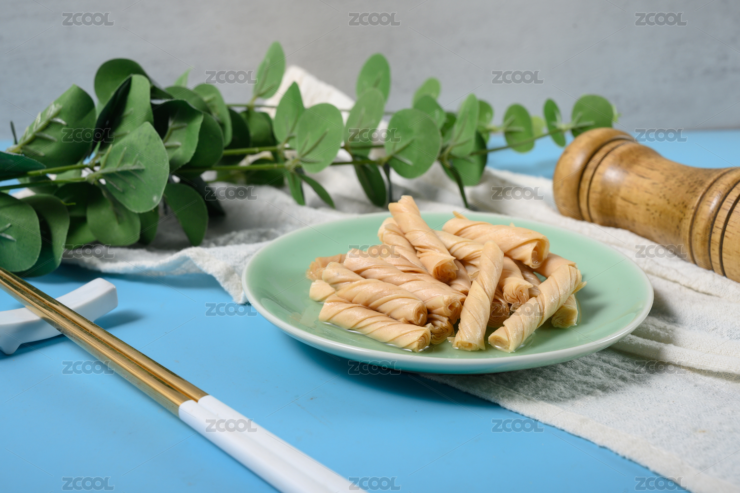 桌面上的盘子里的美味可口的泡发开的豆筋丁