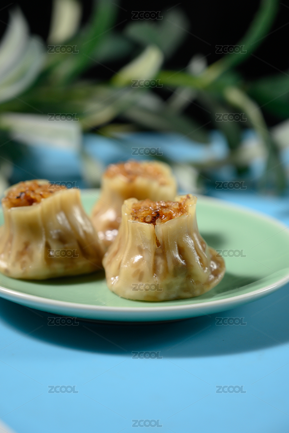 桌面上的盘子里的美味可口的烧卖