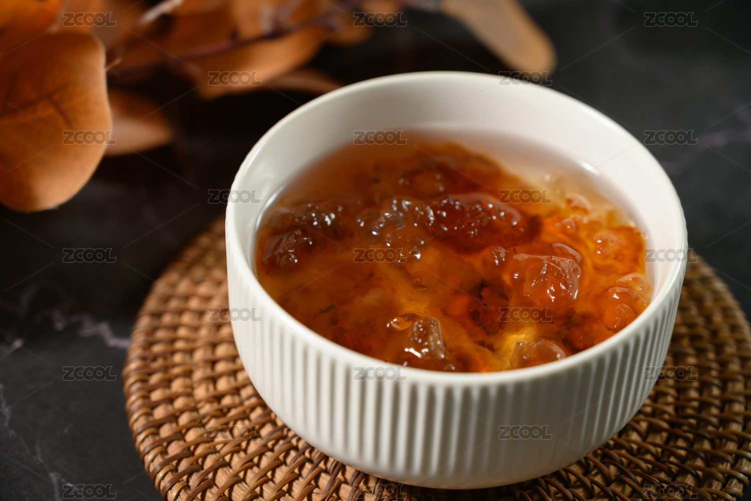 桌面上的盘子里的美味可口的冰糖炖桃胶