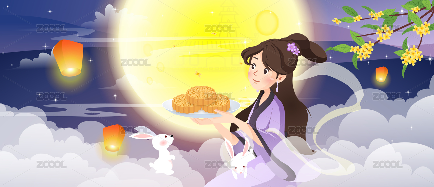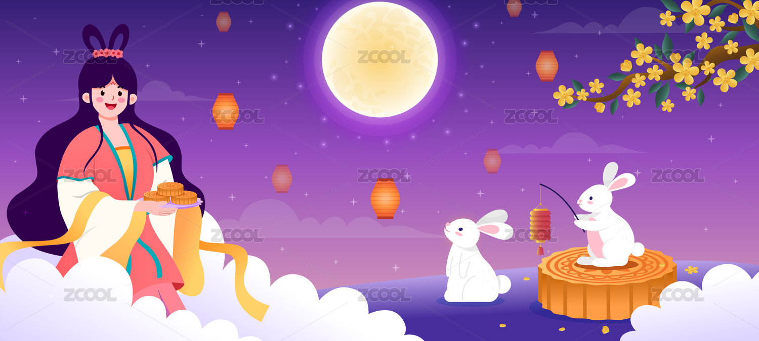 紫色背景下嫦娥美女中秋节手捧月饼插画