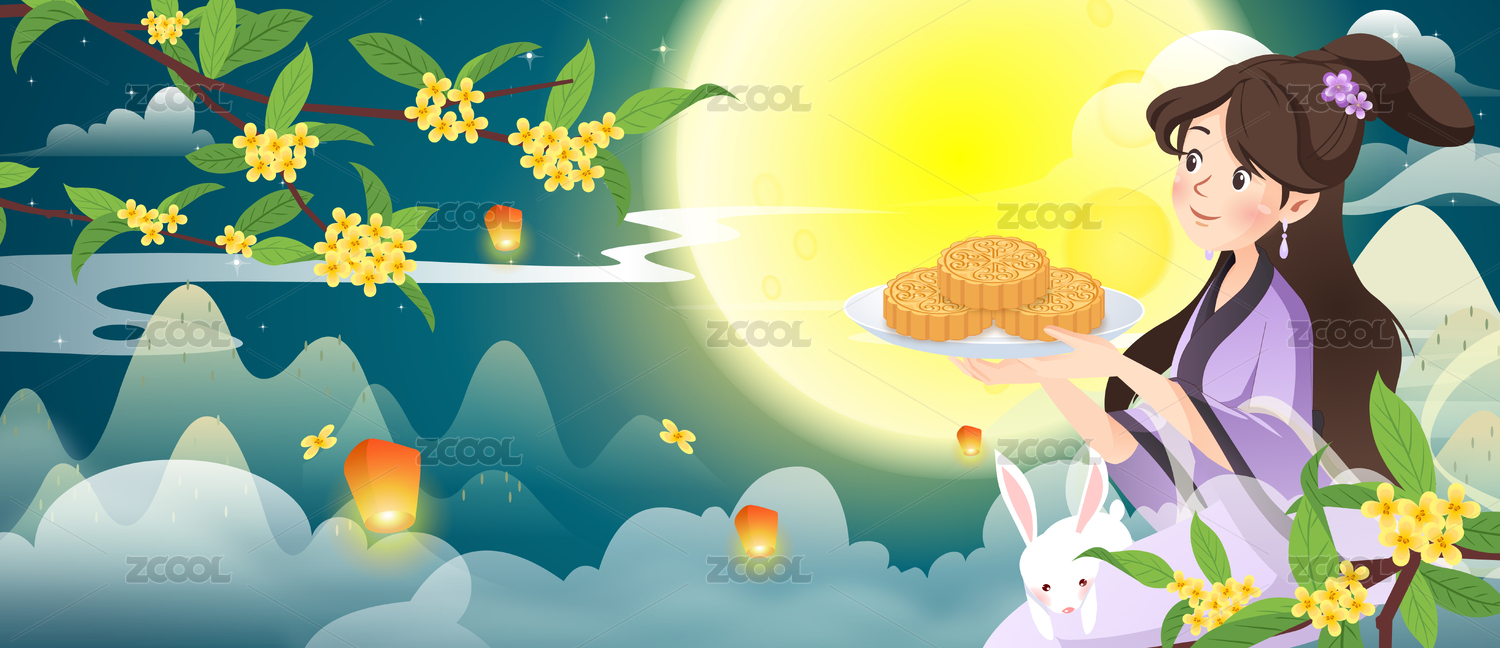 中秋节嫦娥兔子月亮桂花月饼等国潮风插画