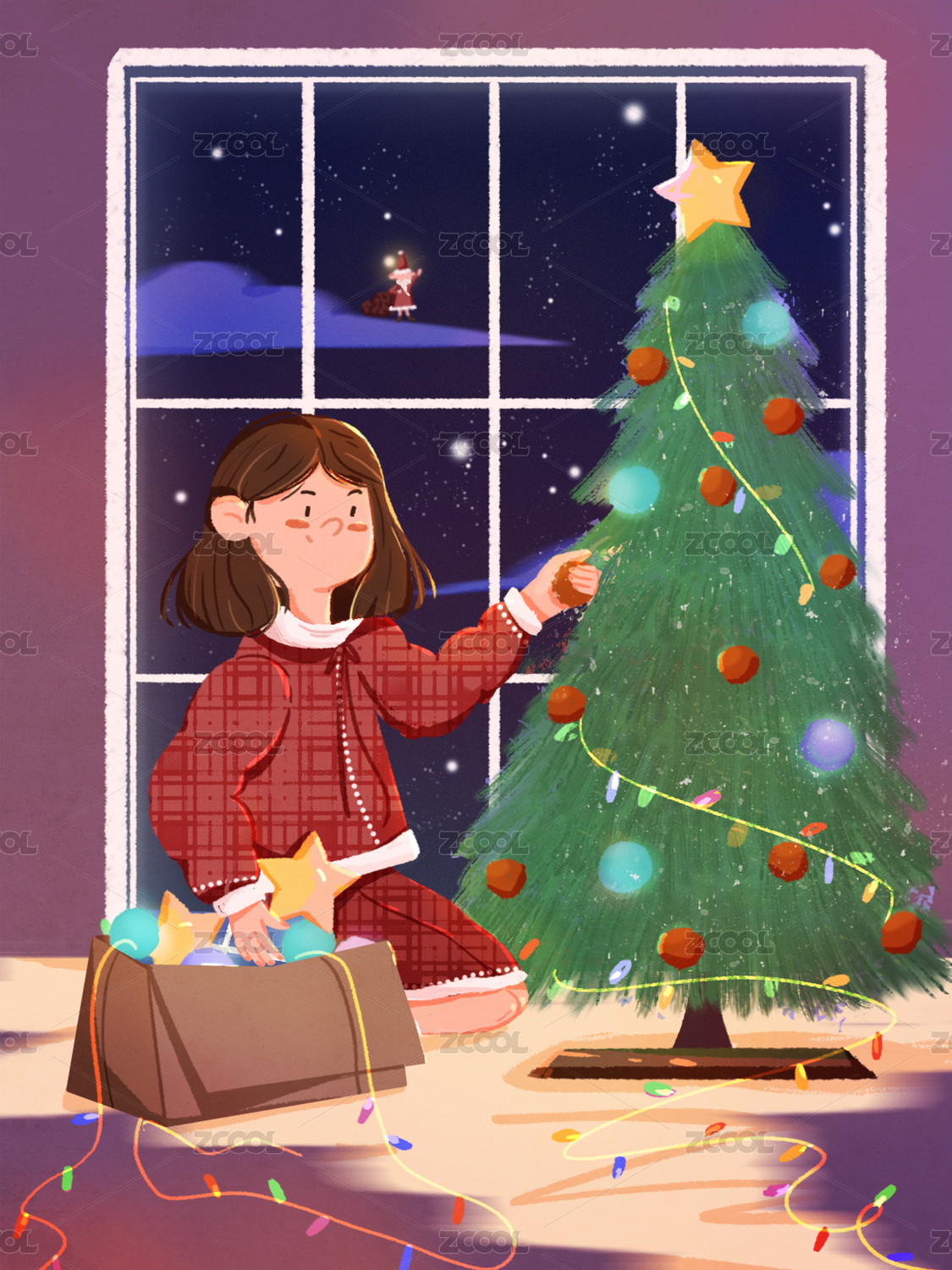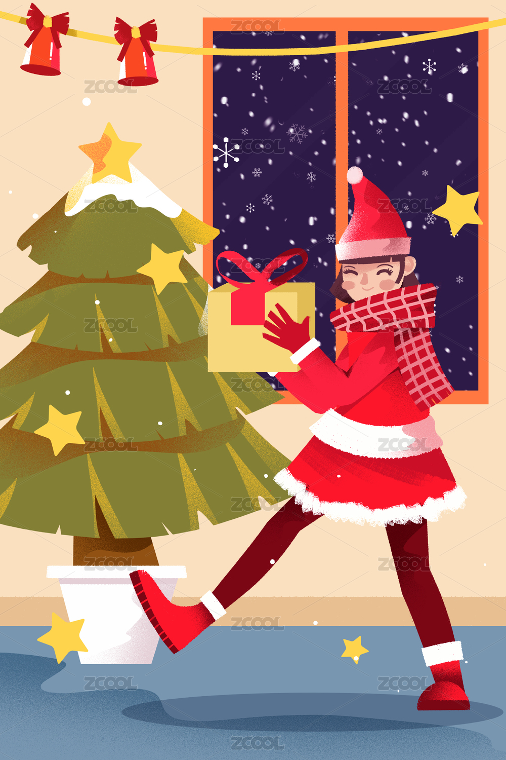 卡通手绘圣诞节唯美风格女孩送礼物开心插画