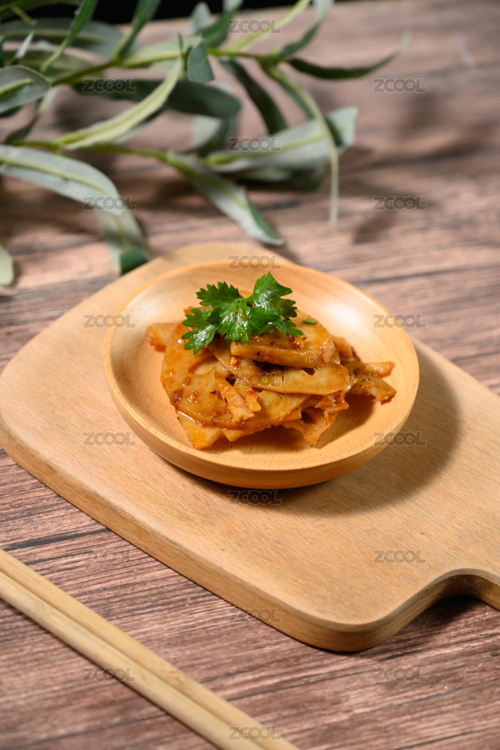 桌面上的盘子里的美味可口的凉拌莲藕片