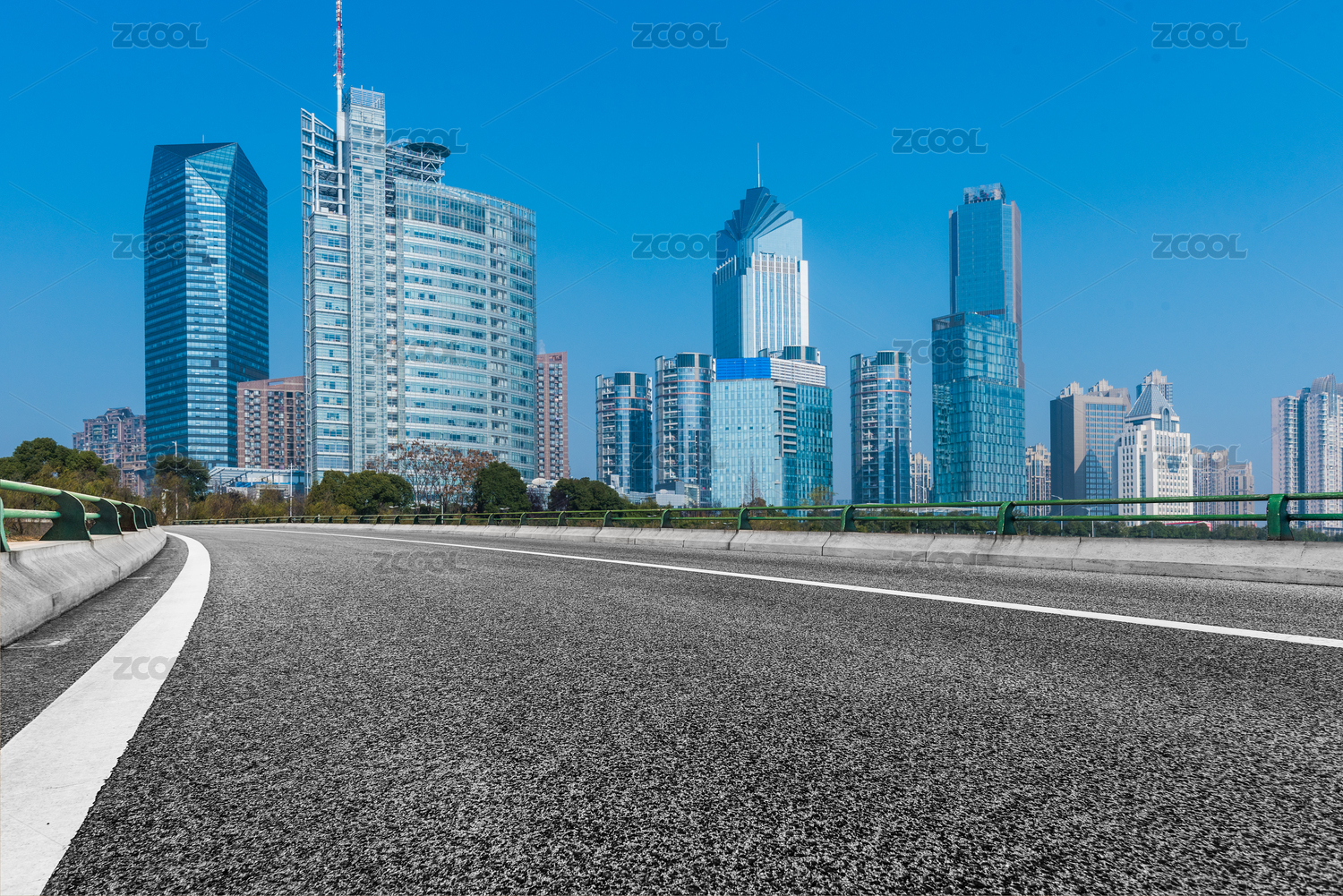 带护栏的沥青路面穿过现代化建筑群,中国上海