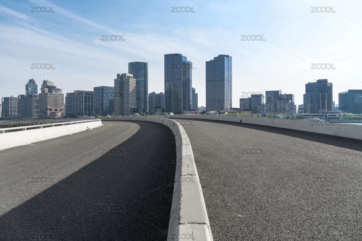 带护栏的具有动感的沥青路面穿过现代化建筑群,中国上海