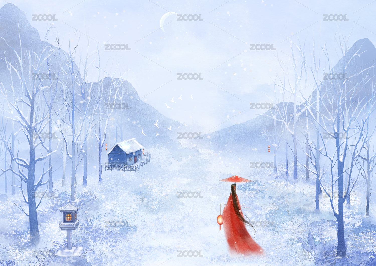唯美冬日雪景插画