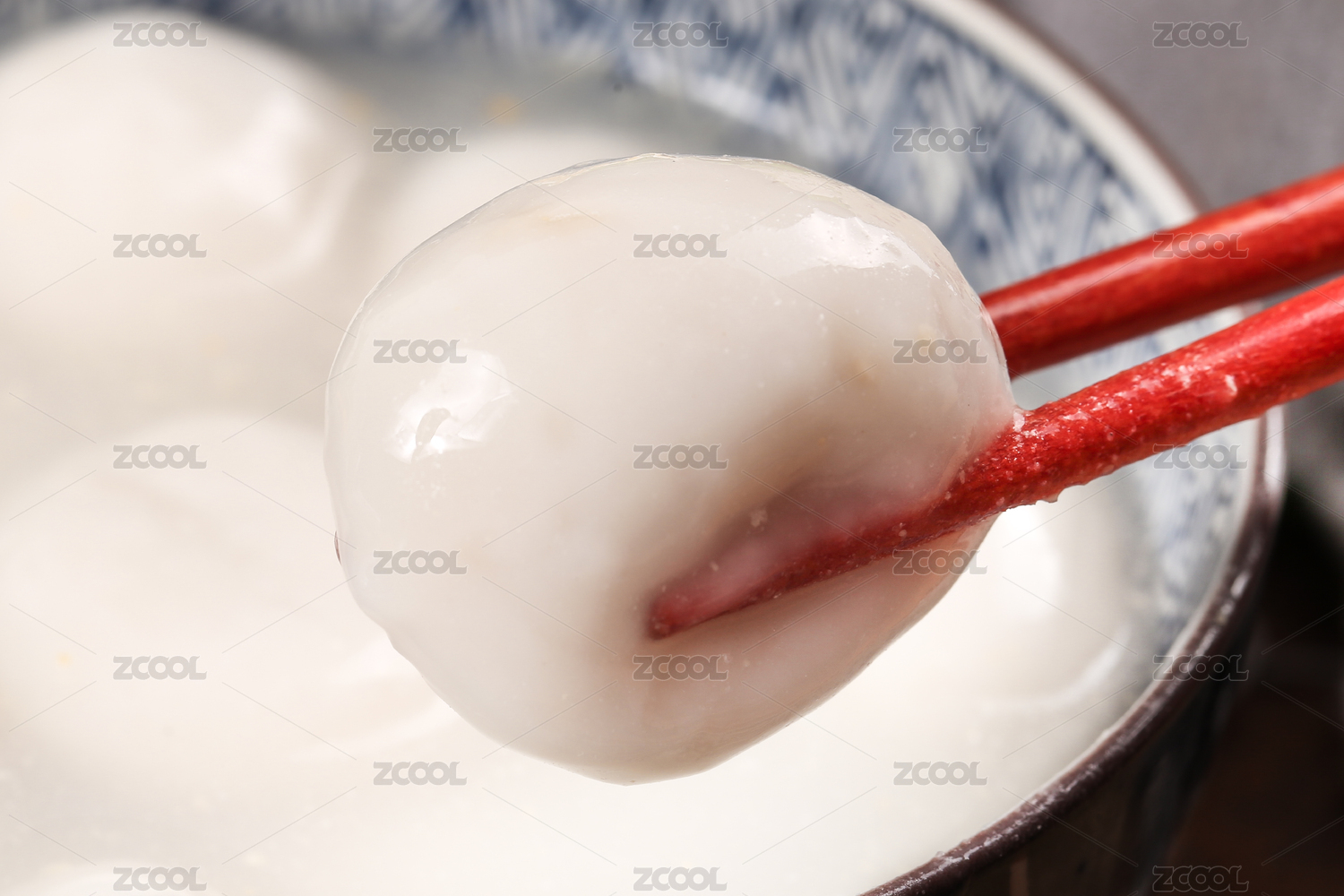 用青花瓷碗装的桂花酒酿小圆子放置在木桌上