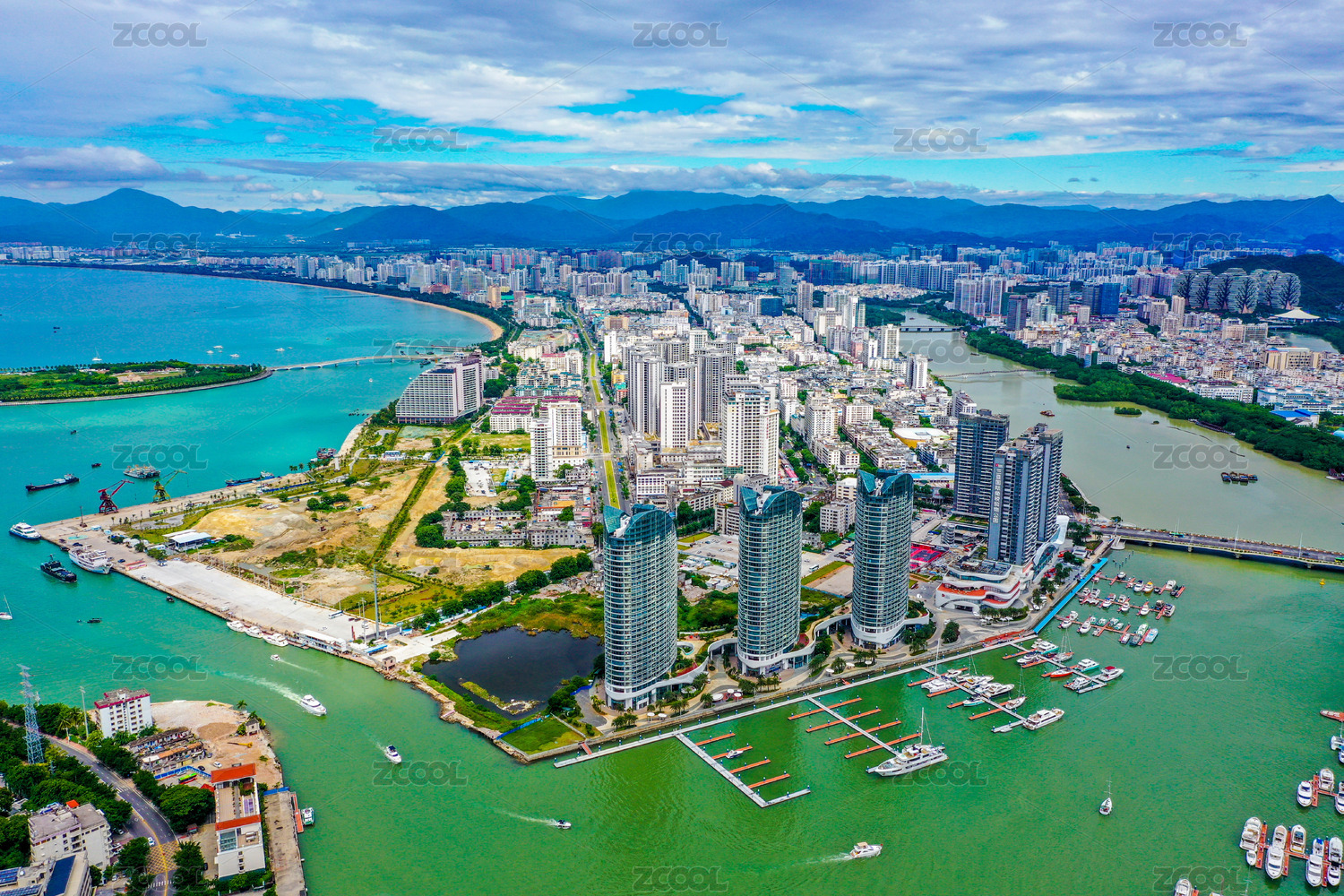 海南三亚三亚湾游艇基地三亚河高视角航拍城