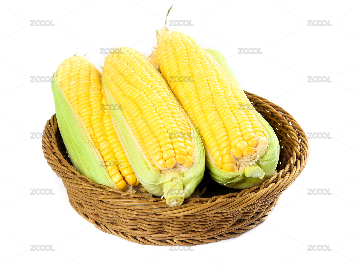 白底上装在篮子里的四根玉米