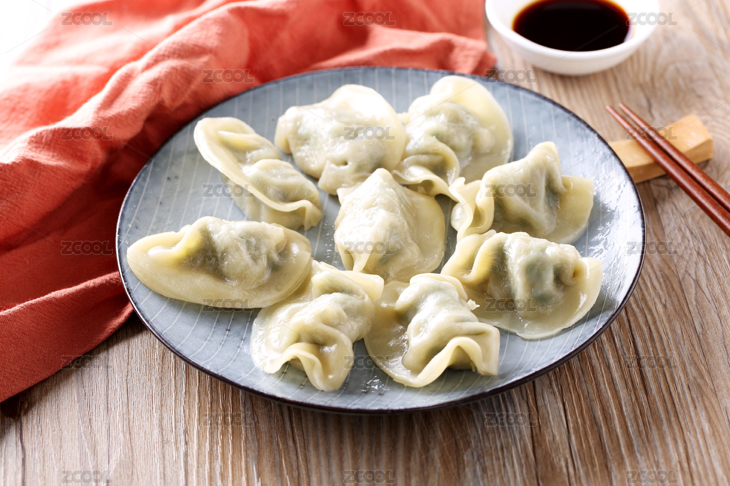 一盘传统美食水饺饺子摆放在窗棂影木桌面上