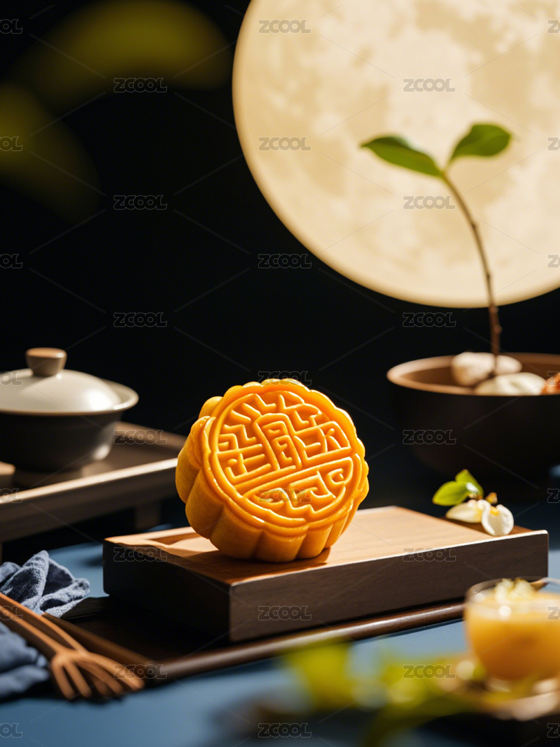 一盘中秋月饼放在中式场景的木质感的桌面上